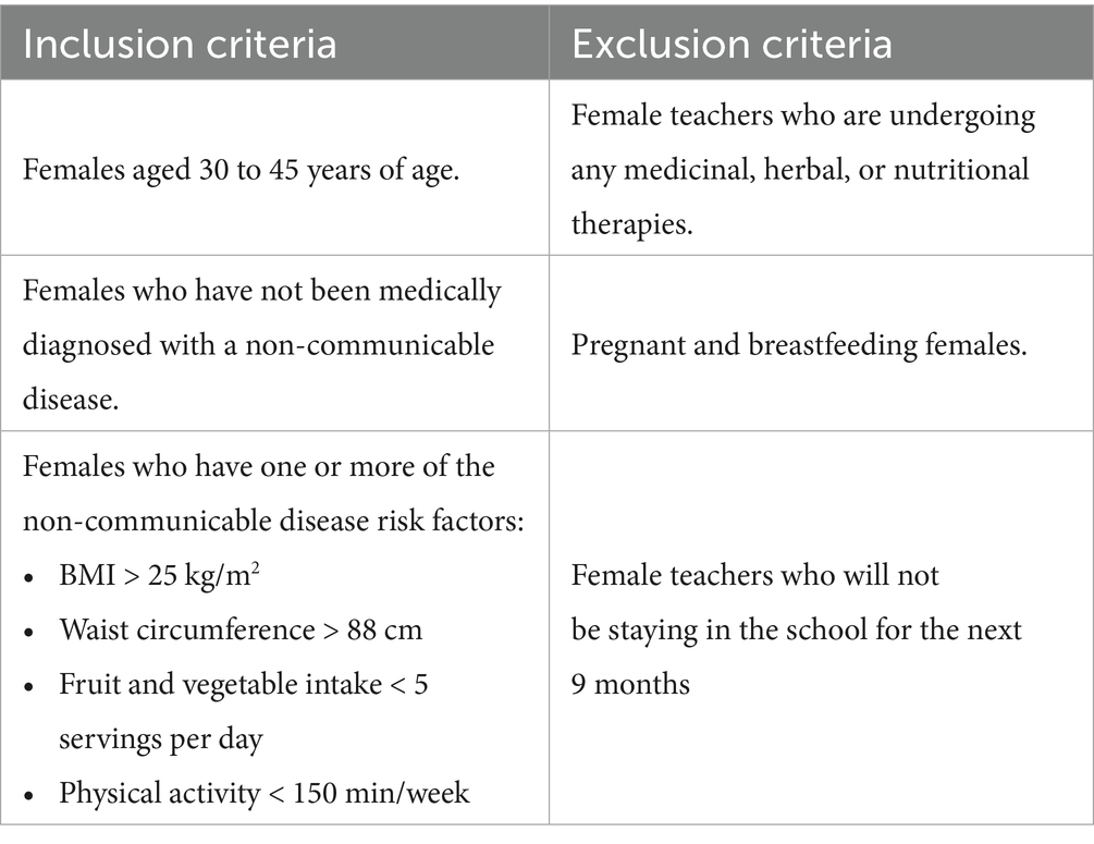 Inclusion and exclusion criteria for the study is shown in Table 1. Female teachers of selected public secondary schools meeting the inclusion criteria will be approached and those consenting to be a part of the study will be recruited.