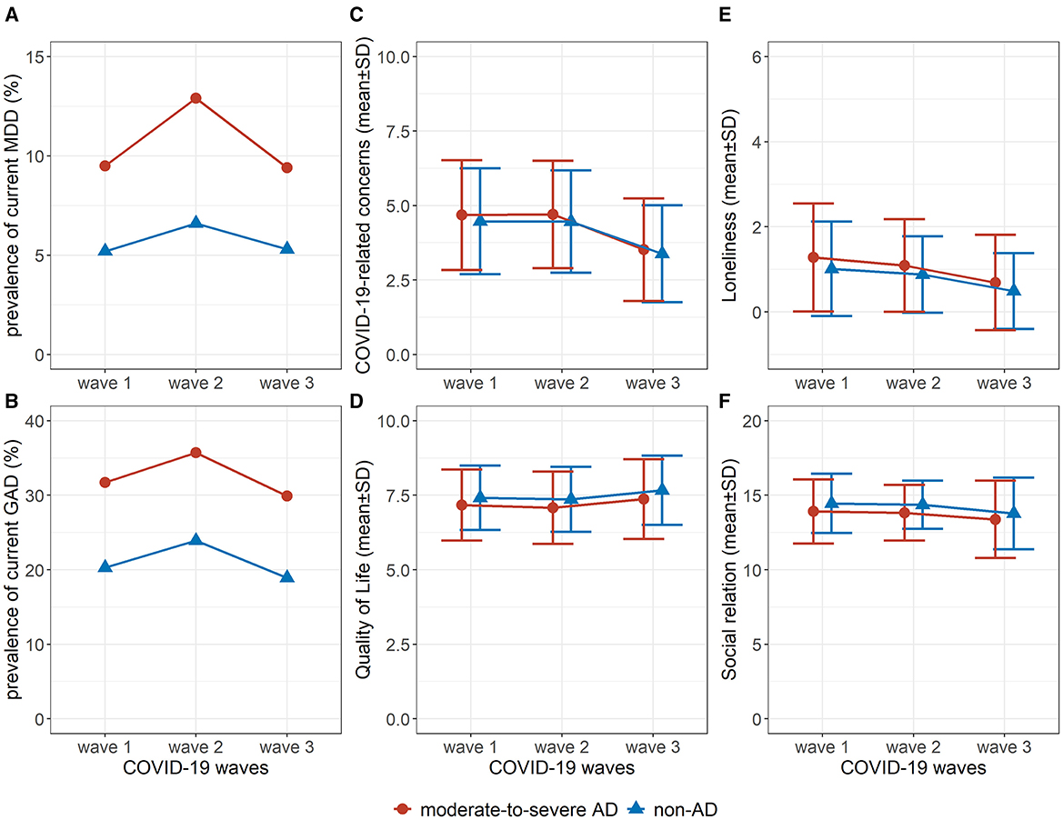 Trajectories of mental health status, pandemic-related wellbeing, and social functioning across the COVID-19 waves among participants with moderate-to-severe AD and those without AD were shown in Figure 1. Compared with participants without AD, those with moderate-to-severe AD showed a higher prevalence of current MDD and GAD, higher COVID-19-related concerns, lower QoL scores, higher loneliness scores, and lower social relations scores across all COVID-19 waves.