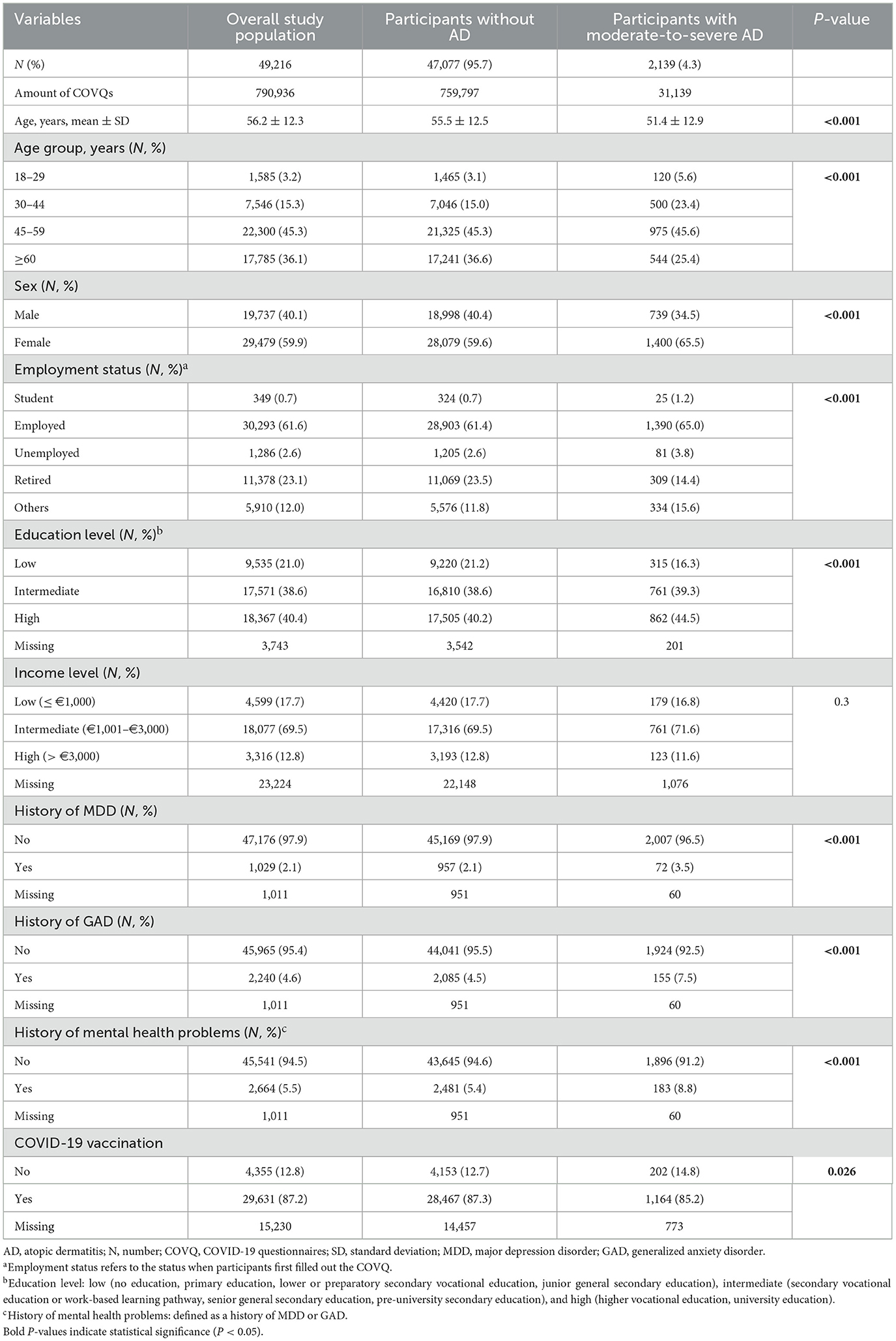In total, 49,216 participants (including 2,139 with moderate-to-severe AD and 47,077 without AD) completed 790,936 COVQs across 31 time points, which were included in the current analysis (Supplementary Figure S2). Overall, compared with participants without AD, those with moderate-to-severe AD were younger, more often female, and more likely to have a history of MDD or GAD, and had a lower rate of COVID-19 vaccination (all P < 0.05, Table 1).