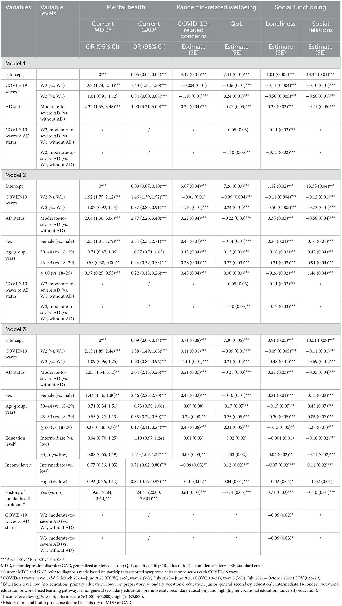 Methods: Between 2020 and 2022, 31 COVID-19 questionnaires (COVQs) were sent to 140,145 Lifelines adult participants, collecting data on mental health [major depression disorder (MDD), generalized anxiety disorder (GAD)], pandemic-related wellbeing [COVID-19-related concerns, quality of life (QoL)], and social functioning (loneliness, social relations). AD information was collected through a digital questionnaire sent to all Lifelines adults in 2020. Data were divided into three waves according to the COVID-19 timeline in the Netherlands: March–June 2020 (wave 1); July 2020–June 2021 (wave 2); July 2021–October 2022 (wave 3). Generalized linear mixed models were performed for each outcome.