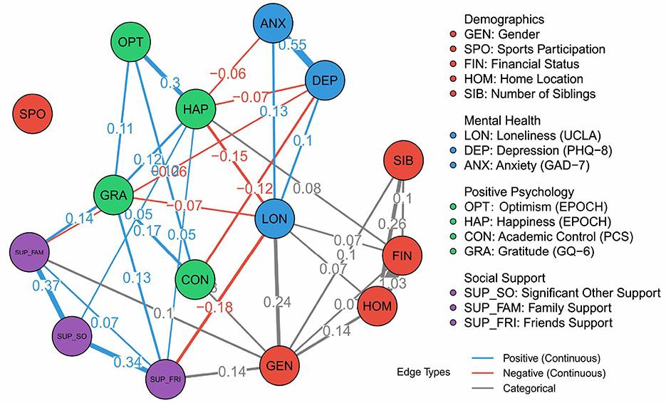 The social support domain, represented by support from family (SUP_FAM), friends (SUP_FRI), and significant others (SUP_SO), is tightly interconnected (e.g., SUP_FAM–SUP_FRI: 0.34), and shows positive associations with positive psychology constructs, while buffering against loneliness.