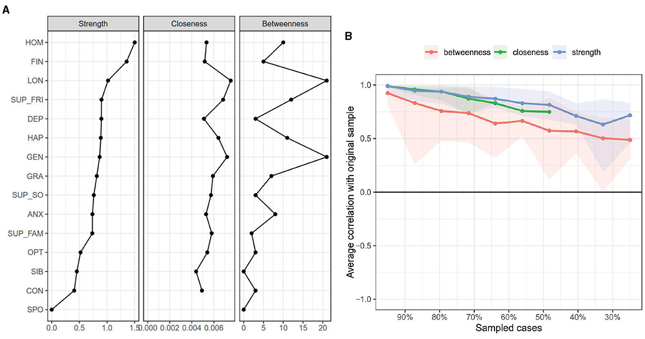 Figure 2. (A) Centrality indices of network nodes. (B) Stability of centrality indices as assessed by case-dropping bootstrapping.