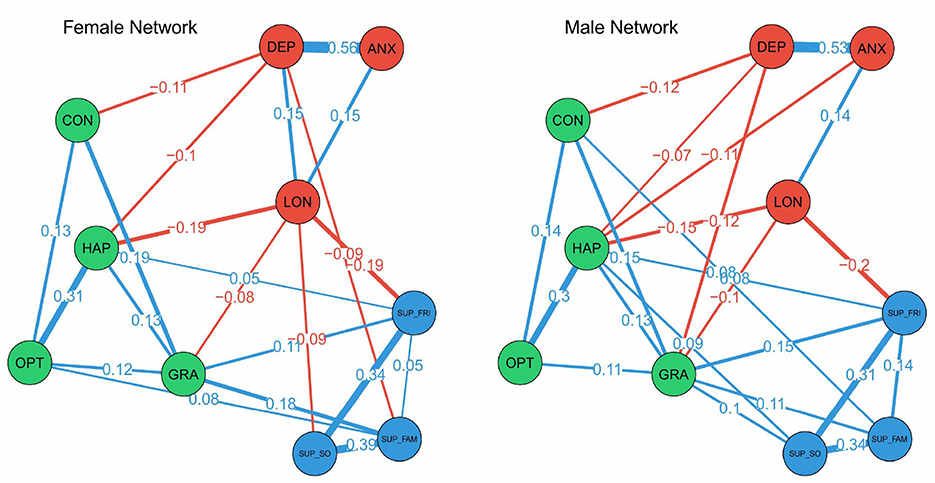 The value of network analysis in this context has been demonstrated in a foundational study (17), which utilized the same dataset to explore the network associations between loneliness, depression, and anxiety symptoms. Their work established loneliness as a significant node connected to internalizing symptoms in Kenyan youth. However, their analysis was primarily focused on this triad of psychopathology. The broader psychosocial ecosystem—encompassing protective factors such as optimism, gratitude, and happiness, as well as different sources of social support—remains unmapped. Furthermore, while socio-cultural factors were considered, a systematic and statistically rigorous comparison of the network structures between genders has not been conducted.