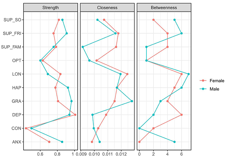 Centrality analysis based on the stable strength index revealed distinct gender patterns in the roles of support and mental health variables (see Figure 4). For males, support from friends (SUP_FRI) showed higher strength centrality, underscoring the pivotal role of peer relationships in their psychosocial network. In contrast, family support (SUP_FAM) was more central for girls. Additionally, depression (DEP) exhibited higher strength centrality in the female network, whereas anxiety (ANX) was more central among males. These findings suggest that based on the overall strength of connections, girls' psychosocial health may be more influenced by family dynamics and depressive symptoms, while boys' networks are more influenced by anxiety and anchored more strongly by peer support.