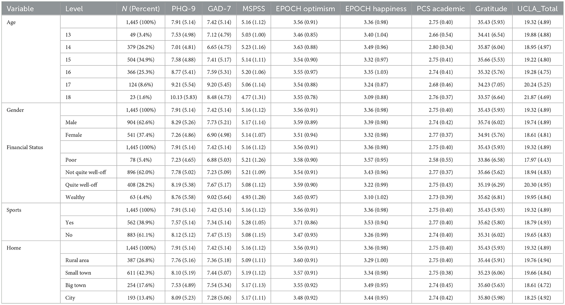 The analytic sample comprised 1,445 Kenyan adolescents, predominantly female (62.6%), with a balanced distribution across ages 13–18 (see Table 1). On average, the sample reported moderate levels of depression (M = 7.91, SD = 5.14) and anxiety (M = 7.42, SD = 5.14), alongside relatively high perceived social support (M = 5.16, SD = 1.12) and moderate-to-high levels of positive psychological variables such as optimism, happiness, and gratitude. Gender differences were evident across multiple domains. Female students reported notably higher mean depression and anxiety scores than males, suggesting a greater psychological symptom burden among girls. This pattern was consistent across both PHQ-8 (females: M = 8.29; males: M = 7.26) and GAD-7 (females: M = 7.73; males: M = 6.90), indicating that emotional distress may be more pronounced in adolescent girls within this context. In contrast, perceived social support, optimism, happiness, and gratitude showed only minimal gender differences, with both groups reporting similar levels overall. Socioeconomic variation was also reflected in the data, but gender disparities in core mental health outcomes remained robust across financial strata. For instance, even among students from wealthier backgrounds, girls exhibited higher mean depression and anxiety scores relative to boys. Sports participation was more common among males, but its association with mental health and positive psychological attributes appeared consistent across genders.