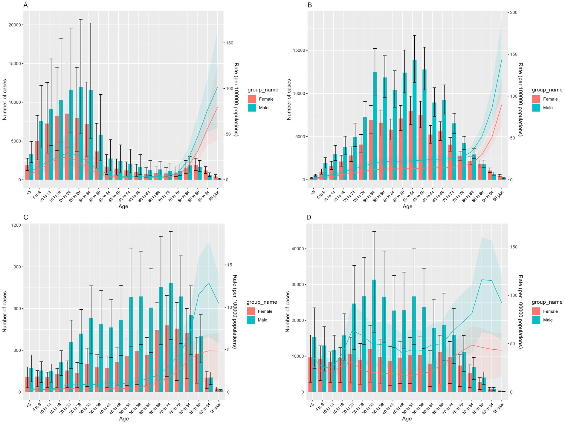 Figure 1. Disease burden of COP across different age groups in China in 2021: (A) number of incident cases and ASIR, (B) number of prevalent cases and ASPR, (C) number of deaths and ASMR, (D) number of DALYs and ASDR. Red represents females, and green represents males. Bars show the number of cases of incidence, prevalence, deaths, and DALYs. Error bars indicate the 95% uncertainty intervals for these numbers. Colored lines represent the age-standardized rates (ASRs) of incidence, prevalence, mortality, and DALYs. The shaded areas indicate the upper and lower bounds of the 95% uncertainty intervals for the ASRs.