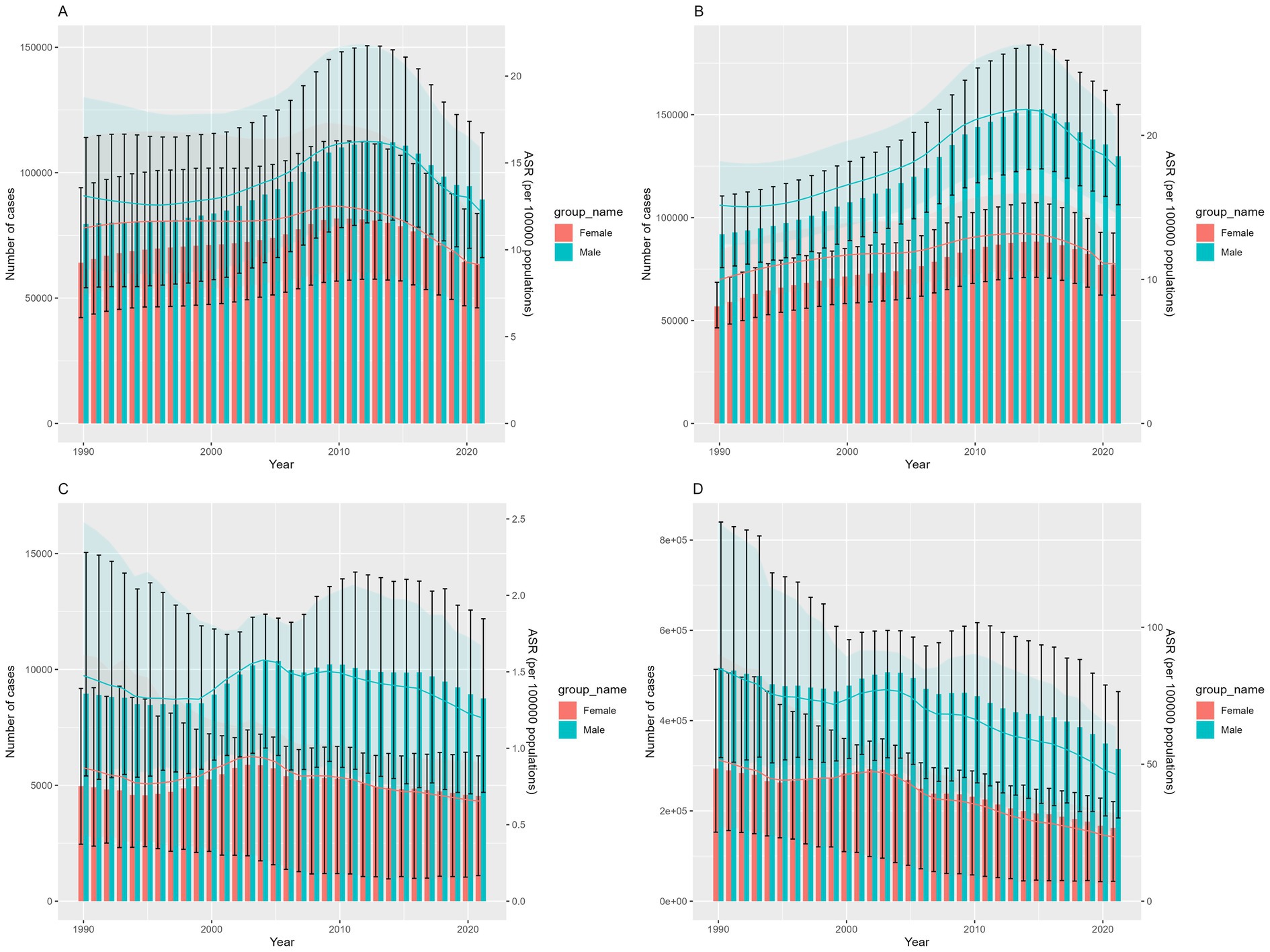 Figure 2. The trend of COP burden in China over time from 1990 to 2021: (A) number of incident cases and ASIR, (B) number of prevalent cases and ASPR, (C) number of deaths and ASMR, (D) number of DALYs and ASDR. Red represents females, and green represents males. Bars show the number of cases of incidence, prevalence, deaths, and DALYs. Error bars indicate the 95% uncertainty intervals for these numbers. Colored lines represent the age-standardized rates (ASRs) of incidence, prevalence, mortality, and DALYs. The shaded areas indicate the upper and lower bounds of the 95% uncertainty intervals for the ASRs.