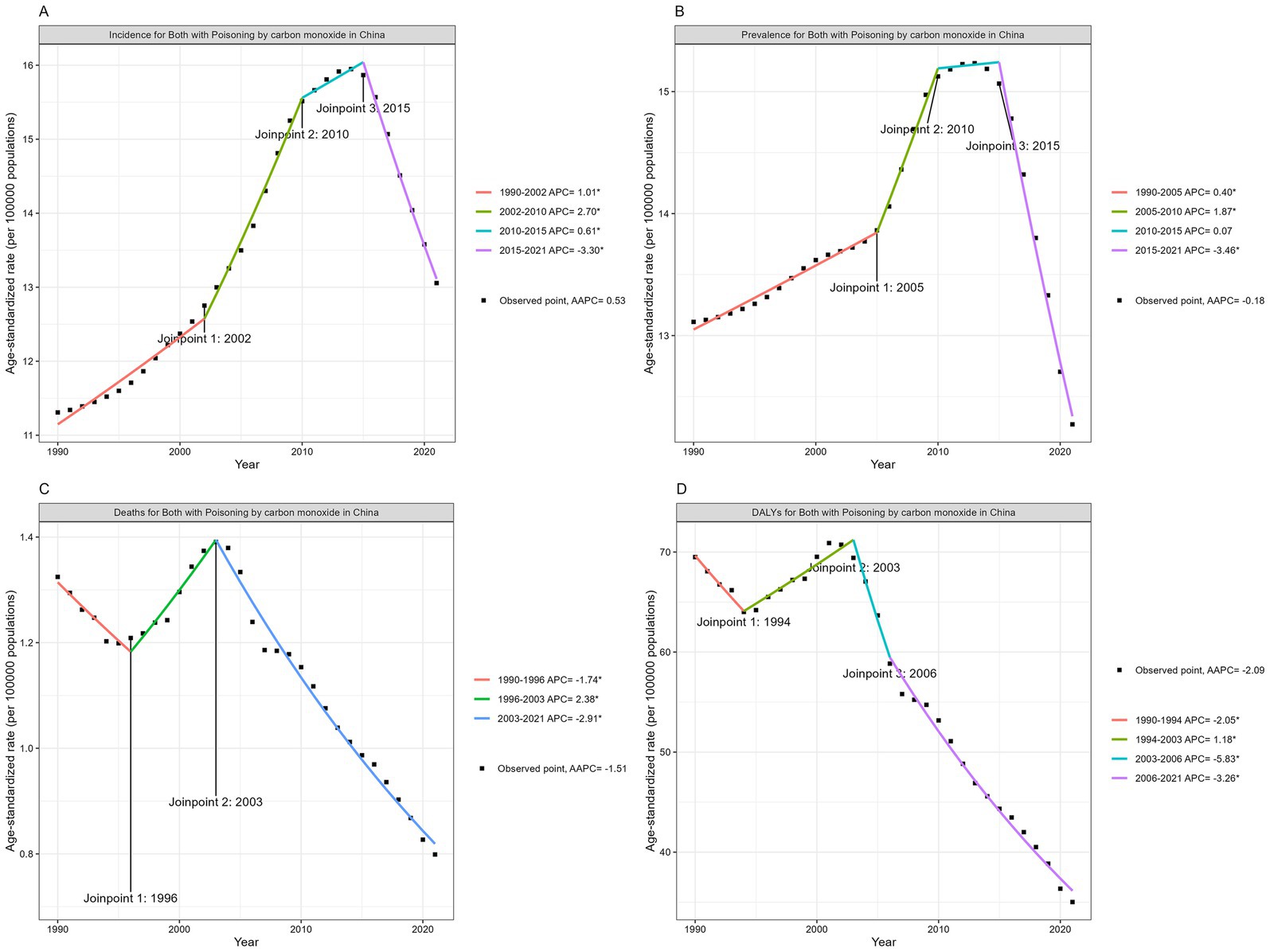 CO, carbon monoxide; COP, carbon monoxide poisoning; GBD, Global Burden of Diseases, Injuries, and Risk Factors Study; UI, uncertainty interval; DALYs, Disability-Adjusted Life Years; ASR, Age-Standardized Rates; ASIR, Age-Standardized Incidence Rate; ASPR, Age-Standardized Prevalence Rate; ASMR, Age-Standardized Mortality Rate; ASDR, Age-Standardized DALYs rate; APC, annual percent change; AAPC, average annual percent change; RR, relative risk.