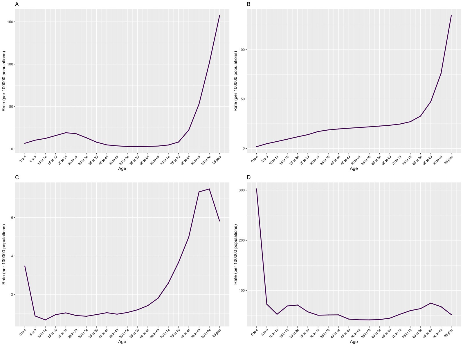 Effect of age: The incidence rate showed a slight upward trend in early life, peaking at 20–24 years of age, followed by a downward trend and a subsequent logarithmic increase starting at age 79. The prevalence rate generally increased with age, exhibiting exponential growth among individuals aged 79 and above. The mortality rate fluctuated considerably, with a high rate in the 0–4 age group, followed by a decline until age 14. Between ages 15 and 54, the mortality rate remained relatively stable with minor fluctuations, including small peaks in the 20–24 and 40–44 age groups. After age 55, the mortality rate began to increase exponentially, reaching a peak in 85–94 age group. The DALY rate was highest in the 0–4 age group, then declined significantly across subsequent age groups, with small peaks observed in the 20–24 and 85–89 age groups (Figure 4).