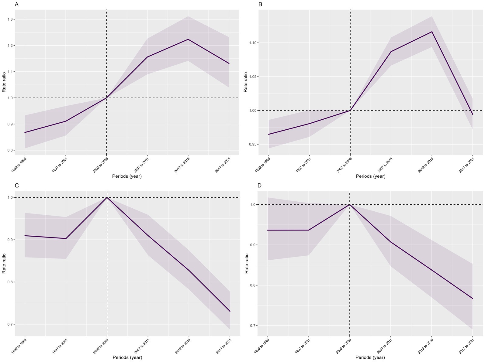 Figure 5. Period effects of COP burden in China from 1990 to 2021: (A) incidence, (B) prevalence, (C) mortality, (D) DALYs. The shaded areas indicate the upper and lower limits of the 95% confidence intervals of the rate ratio.