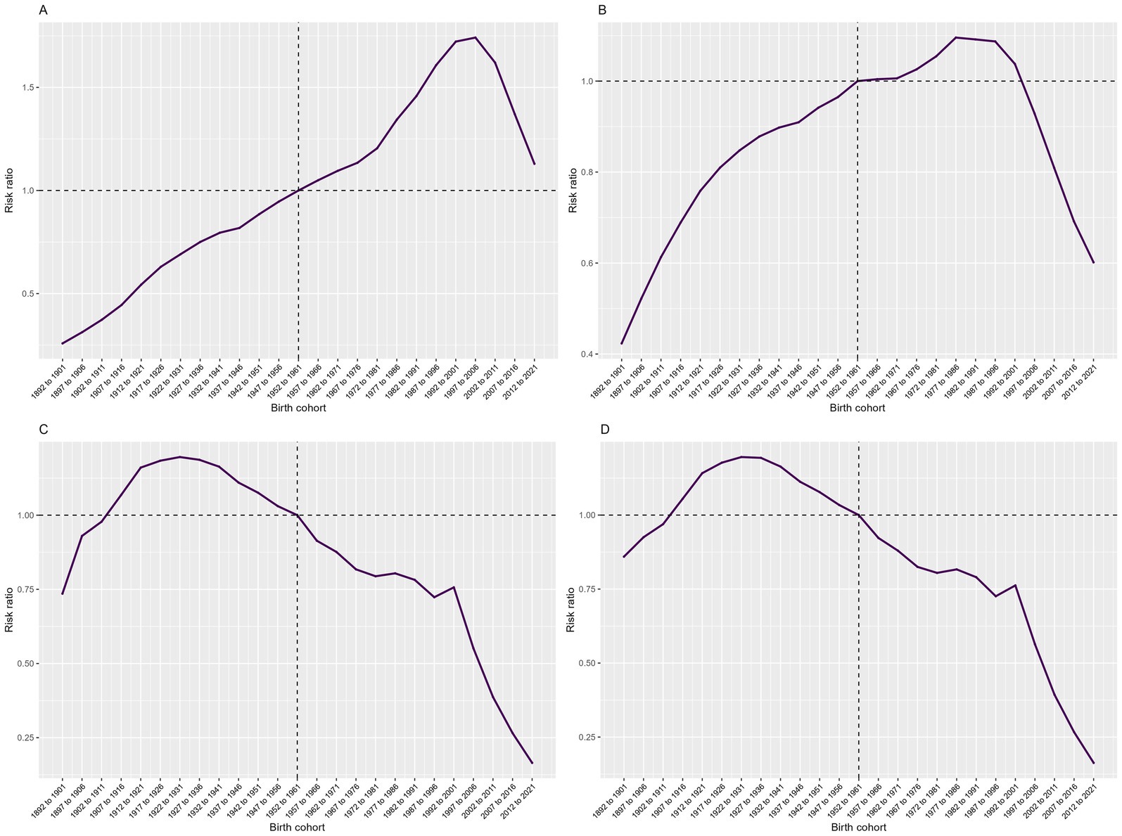 Figure 6. Cohort effects of COP burden in China from 1990 to 2021: (A) incidence, (B) prevalence, (C) mortality and (D) DALYs.
