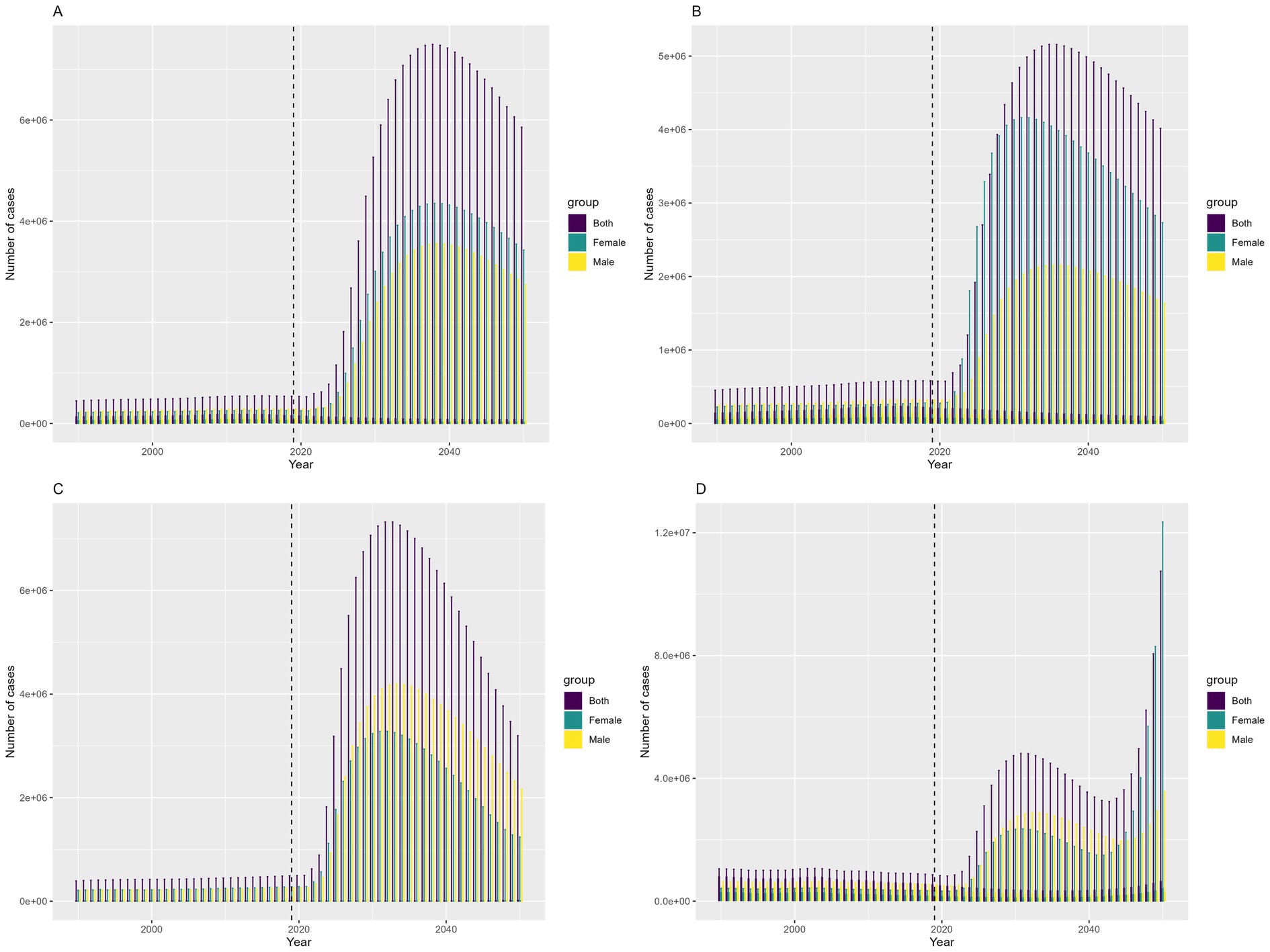 Figure 7. Prediction of the change trend of COP burden in China from 2022 to 2050: (A) number of incident cases, (B) number of prevalent cases, (C) number of deaths, (D) number of DALYs.