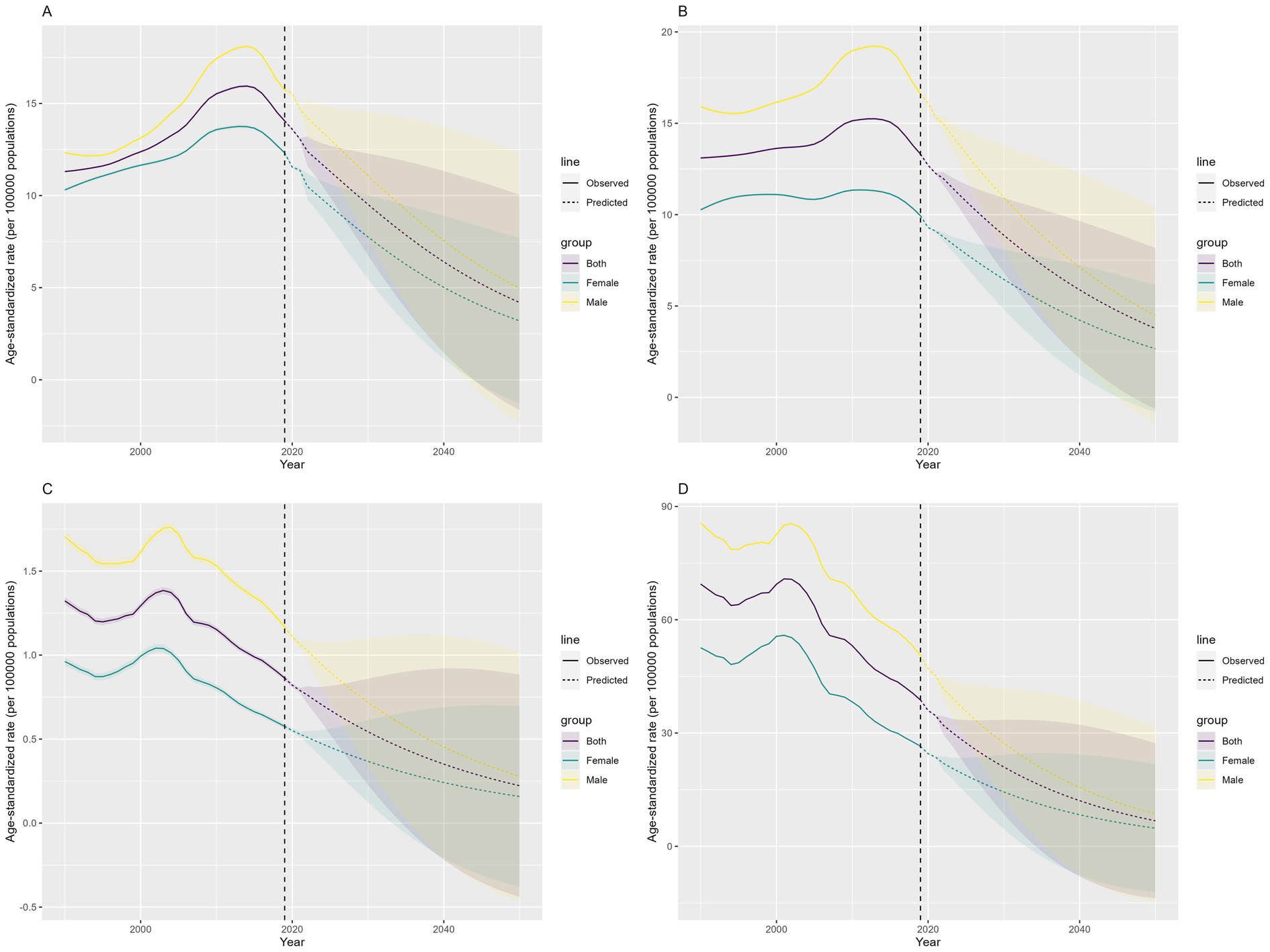 Figure 8. Prediction of the change trend of COP burden in China from 2022 to 2050: (A) ASIR, (B) ASPR, (C) ASMR, (D) ASDR. Yellow represents males, green represents females, and purple represents both sexes. The shaded areas indicate the upper and lower limits of the 95% uncertainty intervals.