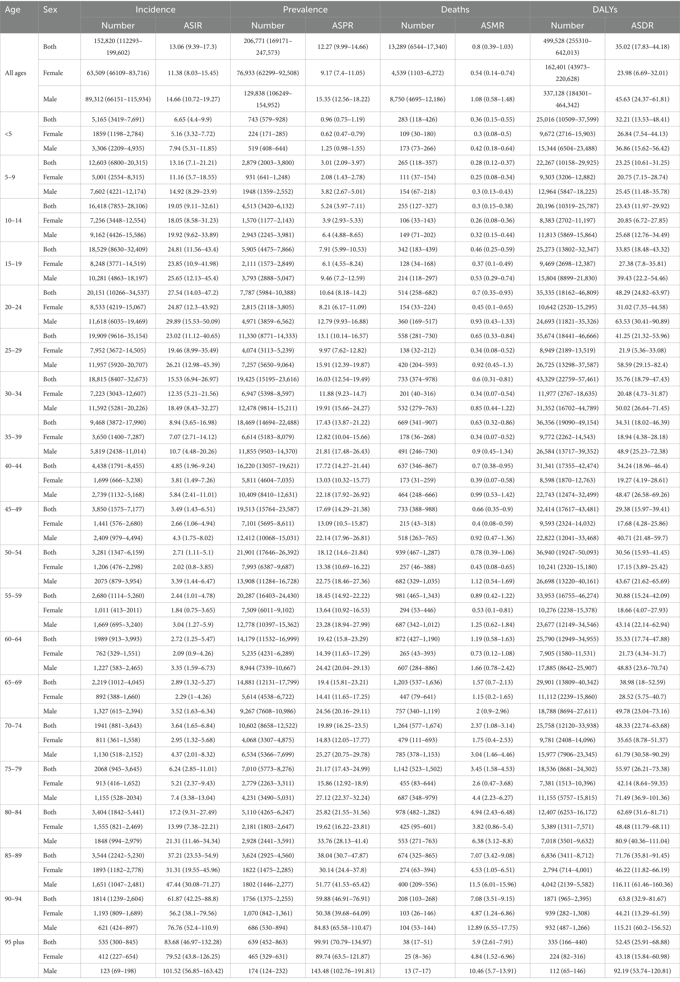 In 2021, there were 152,820 (95% UI, 112,293–199,602) new cases of COP in China, with an ASIR of 13.06 (95% UI, 9.39–17.3) per 100,000 population. In the same period, there were 206,771 (95% UI, 169,171–247,573) prevalent cases, with an ASPR of 12.27 (95% UI, 9.99–14.66) per 100,000. The number of deaths due to COP was 13,289 (95% UI, 6,544–17,340), with an ASMR of 0.8 (95% UI, 0.39–1.03) per 100,000. The DALYs attributed to COP was 499,528 (95% UI, 255,310–642,013), with an ASDR of 35.02 (95% UI, 17.83–44.18) per 100,000 (Table 1).