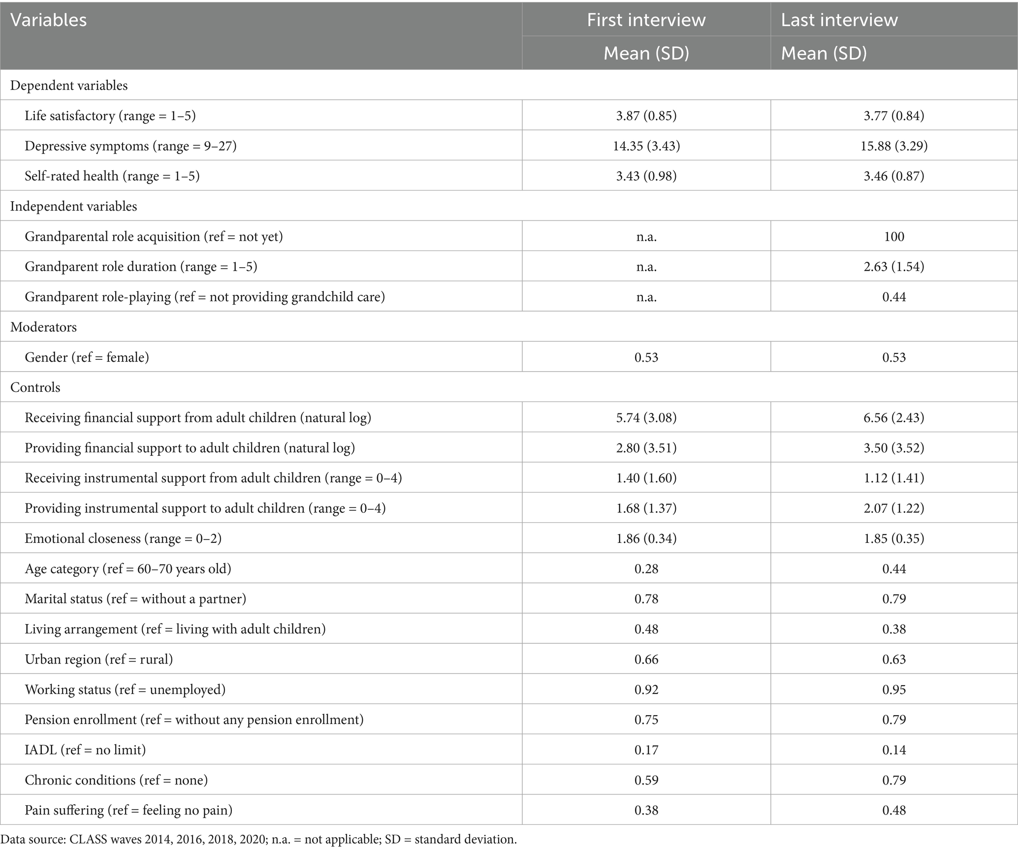 We first presented the descriptive statistical characteristics of the older adults at both the initial and final interviews. Subsequently, we estimated the well-being effects of the transition into grandparenthood using linear fixed-effect regression models. The fixed-effect model captures within-individual changes in older adults’ well-being associated with the transition into grandparenthood (56), specifically focusing on the shift from not having grandchildren to having at least one grandchild, the time duration since becoming a grandparent, and providing childcare. A key advantage of the fixed-effect regression model is its ability to control for unobserved time-invariant individual heterogeneity, such as personal traits or genetic predispositions, which could otherwise bias the results (12, 56). The general fixed-effect regression model can be described as follows (see Equation 1).