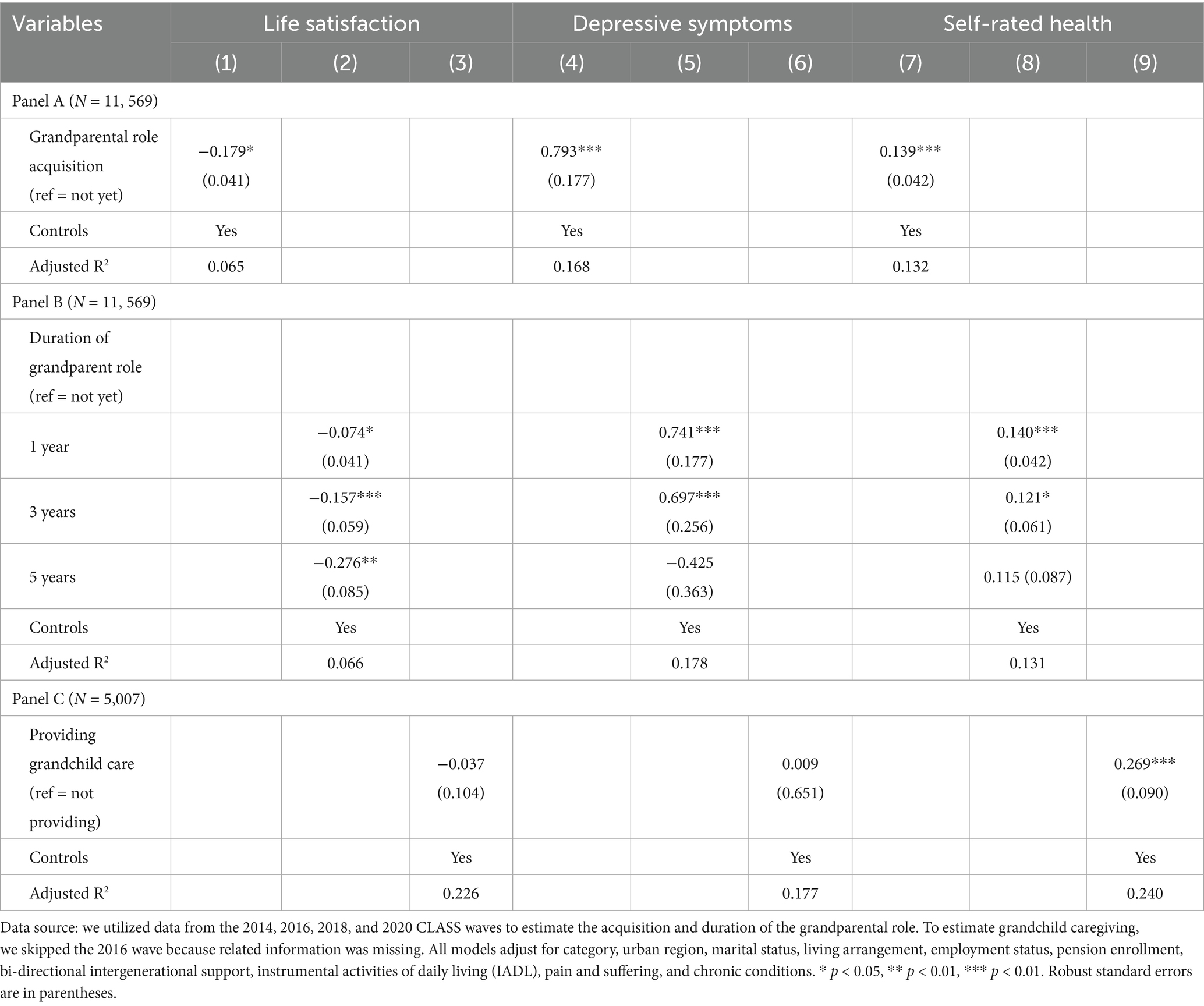 In longitudinal data analysis, addressing endogeneity is crucial to avoid biased estimates. However, in this study, the transition into grandparenthood was not significantly influenced by endogenous factors related to the variables of interest. The decision to take on a grandparent role and the duration of this role are more likely determined by the choices of adult children rather than by the well-being and health of the grandparents themselves. Additionally, when examining the impact of providing childcare, individuals with limitations in daily activities were excluded from the analysis. Moreover, we accounted for chronic conditions, pain, and the ability to perform instrumental activities of daily living to minimize potential biases related to selective grandparenting. To assess the robustness of our fixed-effects estimates and validate our findings, we conducted additional analyses using alternative regression approaches. Specifically, we utilized pooled ordinary least squares (POLS) and random-effects (RE) regression models as sensitivity checks (57). While the fixed-effects model remains our preferred choice because it controls for unobserved time-invariant heterogeneity, these alternative models offer valid comparisons to examine the consistency of our results across different assumptions (58).