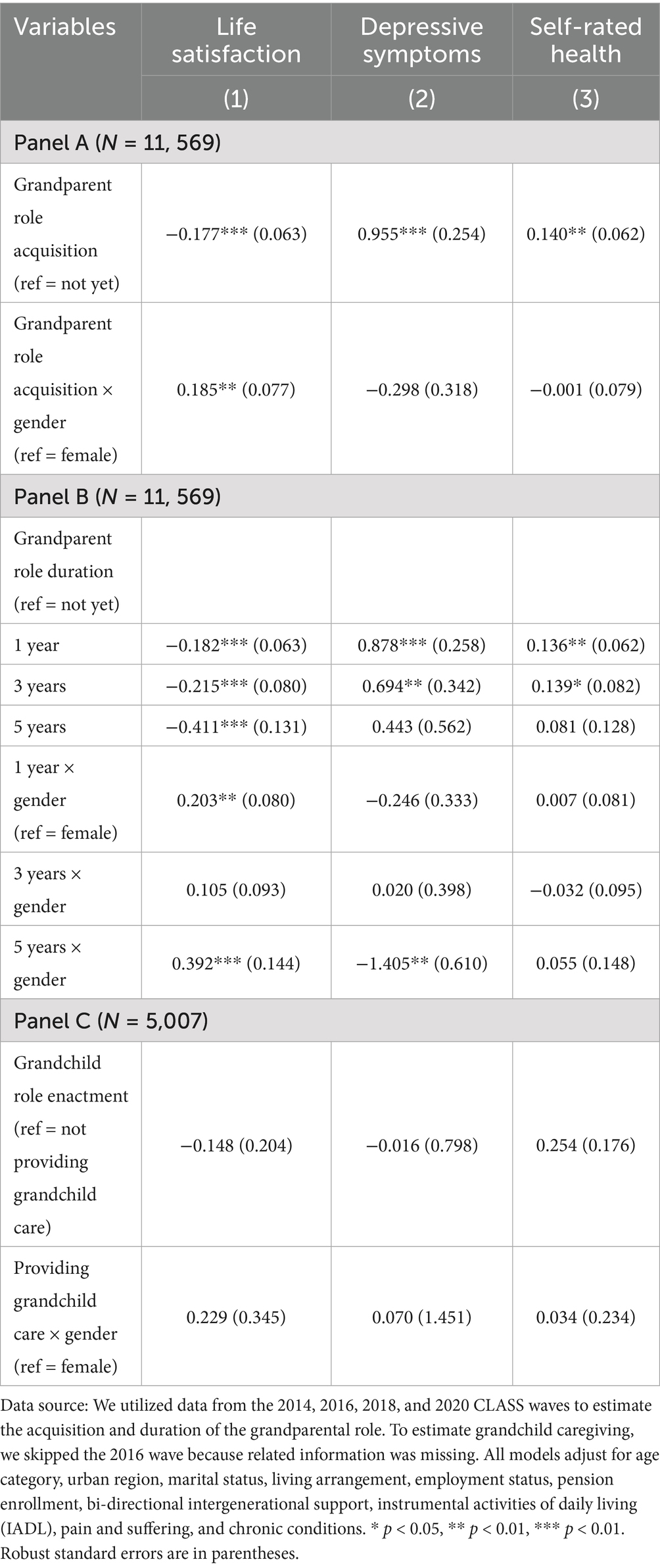 First, our longitudinal analysis reveals that the transition into grandparenthood is associated with lower reported life satisfaction and increased depressive symptoms, offering limited support for Hypothesis 1. These findings align with role strain theory (19) and are consistent with previous studies conducted in Western contexts (6, 14, 37, 40). The adoption of a new grandparental role, accompanied by its associated responsibilities, may disrupt the equilibrium of older adults’ existing multiple roles, leading to psychological strain, stress accumulation, and emotional exhaustion (9). However, these findings do not imply a complete absence of positive effects associated with becoming a grandparent. In line with Chinese cultural norms that emphasize filial piety and intergenerational continuity, assuming the role of a grandparent often allows older adults to derive joy and fulfillment from the arrival of a new generation. This role offers a sense of purpose and value tied to extending the family lineage, contributing to their perception of life’s broader significance and their overall well-being (59–61). As such, while becoming a grandparent is associated with certain psychological rewards, our results suggest that the immediate emotional and psychological costs of assuming this new identity often outweigh these benefits.