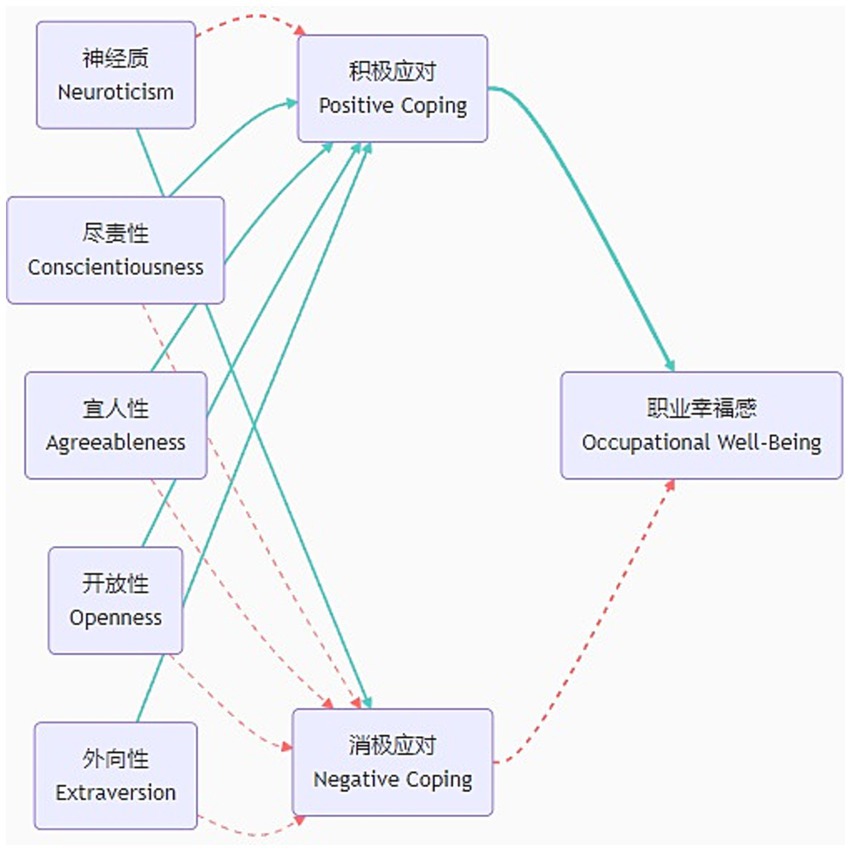 Results: Personality traits showed significant correlations with occupational well-being: Extraversion, conscientiousness, agreeableness, and openness were positively correlated with well-being (r = 0.337 to 0.400), while neuroticism was negatively correlated (r = −0.338). Coping styles played a pivotal mediating role: Neuroticism indirectly reduced well-being through negative coping strategies (e.g., problem avoidance), while conscientiousness, agreeableness, openness, and extraversion correlated with positive coping strategies (e.g., active problem-solving) and higher well-being. The mediating effect of positive coping was substantially larger, accounting for 23.69 to 31.93% of the total effects, whereas negative coping accounted for less than 5.69%.