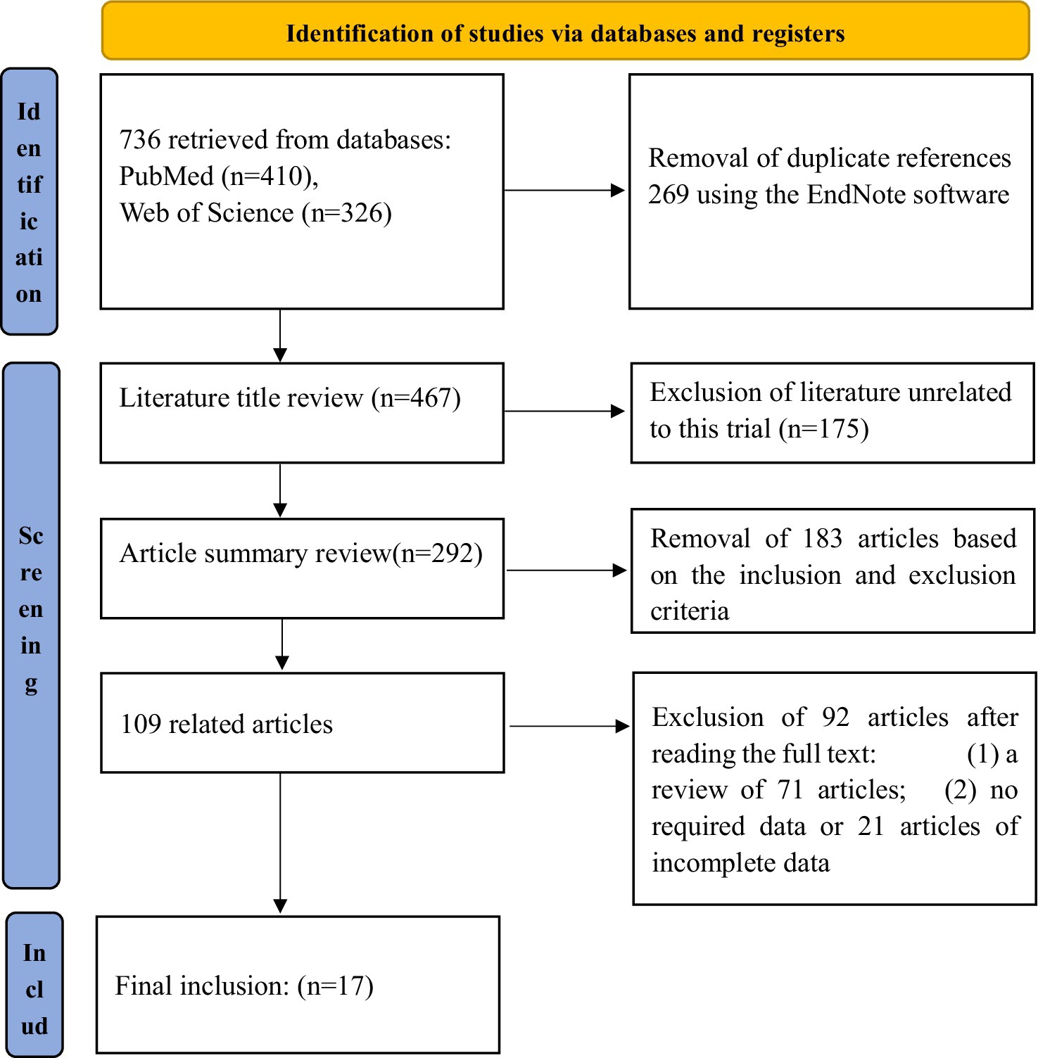 An initial retrieval resulted in the inclusion of 736 records. Finally, 17 (10–26) studies were ultimately included in the meta-analysis following the removal of 269 duplicate articles, 175 irrelevant studies, 183 articles that did not meet the inclusion/exclusion criteria, 71 review articles, and 21 studies with missing or incomplete data. The total number of cases analyzed was 28, 186,905 (Figure 1). The baseline characteristics of the included studies are presented in Table 1.