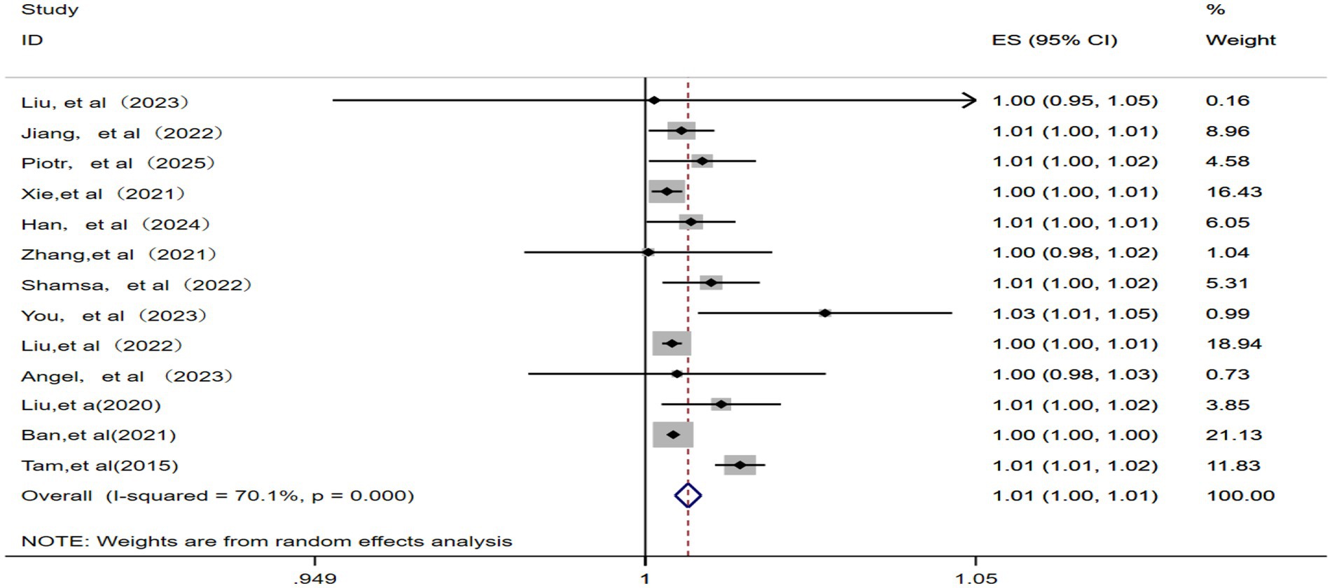 Among the 13 studies (11–13, 15–18, 20–25) included, significant statistical heterogeneity was observed (p = 0.000, I2 = 70.1%), resulting in the use of a random effects model. As a result, the pooled RR for IHD-attributable hospitalization was 1.01 (95% CI: 1.00–1.01) for every 10 μg/m3 increase in ambient PM2.5 concentration, as shown in Figure 2.