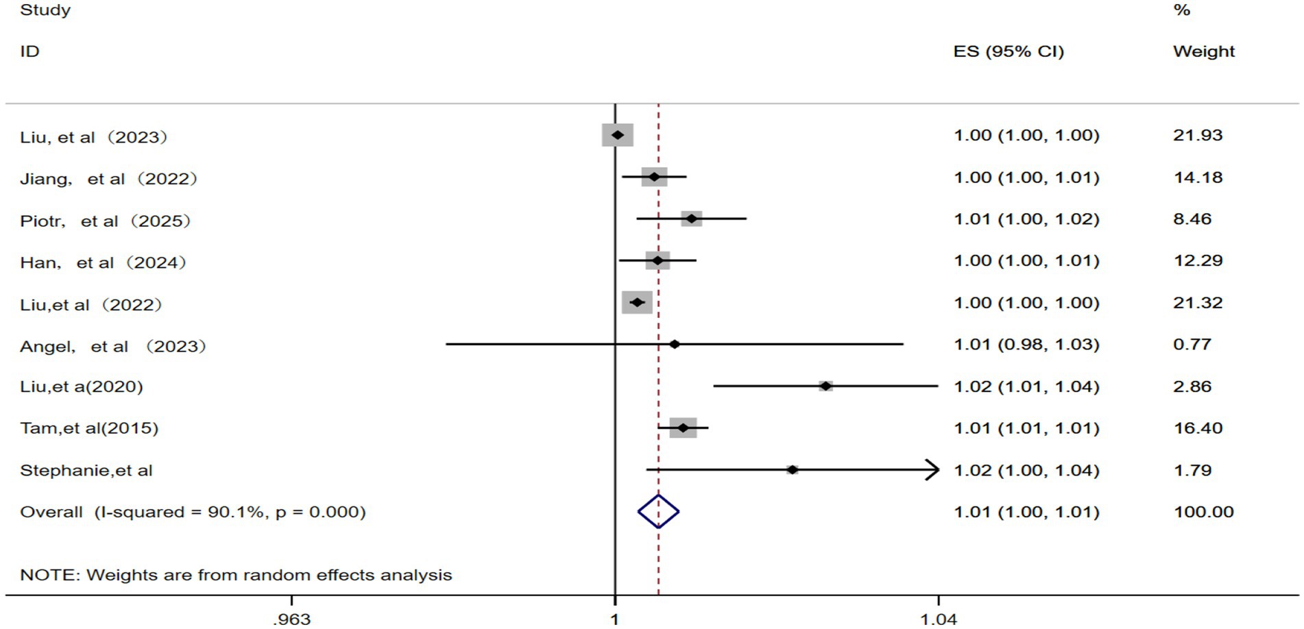 This analysis included nine studies (12, 13, 15, 17, 22–26) and identified significant statistical heterogeneity (p = 0.000, I2 = 90.1%). Therefore, a random effects model was applied. As illustrated in Figure 3, the pooled RR for IHD-attributable hospitalization was 1.01 (95% CI: 1.00–1.01) for every 10 μg/m3 increase in ambient PM10 concentration.