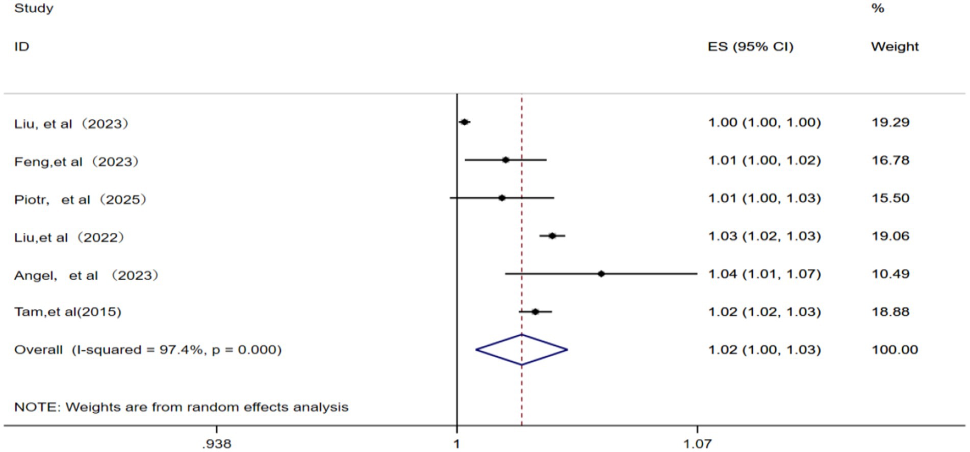 Figure 7. Forest plot of the meta-analysis on the association between O3 exposure and IHD-attributable hospitalization.