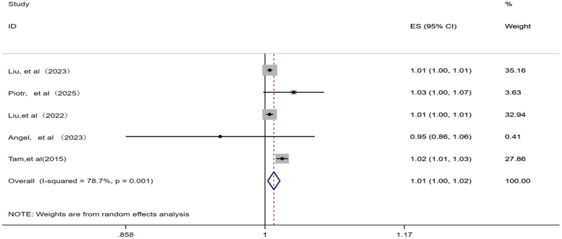 A total of five studies (12, 15, 22, 23, 25) were included in the analysis. With the identification of significant statistical heterogeneity across the studies (p = 0.001, I2 = 78.7%), a random effects model was applied for meta-analysis. Consequently, each 10 μg/m3 increase in ambient SO2 concentration was associated with a pooled RR of 1.01 (95% CI: 1.00–1.02) for IHD-attributable hospitalization, as depicted in Figure 5.