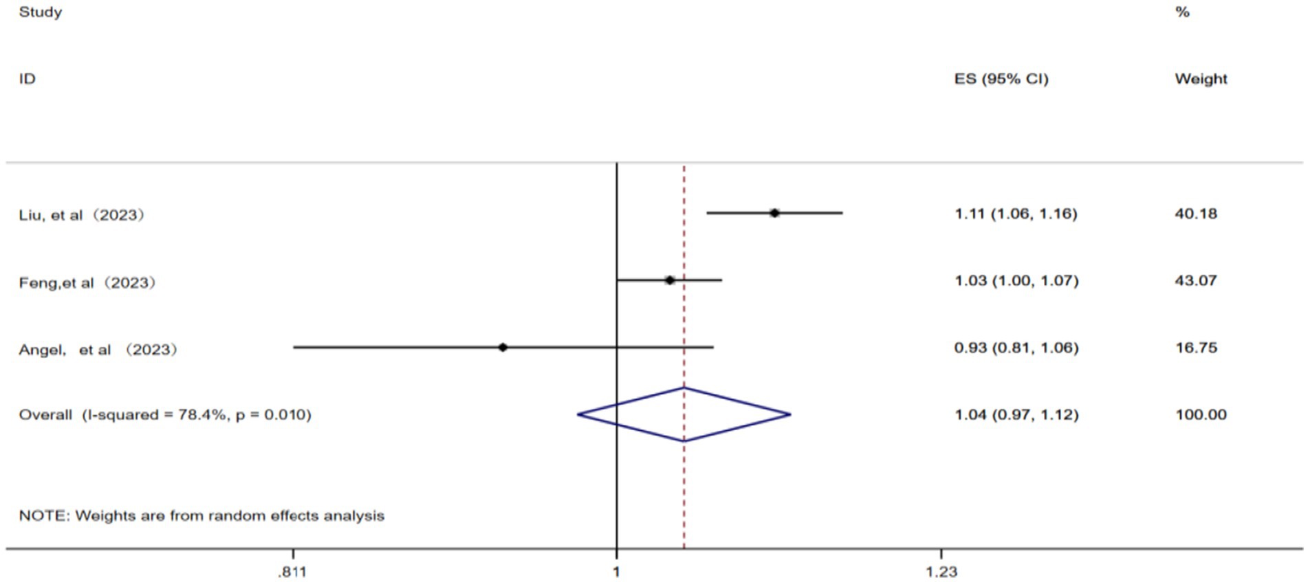 A total of three studies (12, 14, 23) were included in this analysis. A random effects model was applied considering the presence of significant statistical heterogeneity among the studies (p = 0.01, I2 = 78.4%). The meta-analysis revealed that for each 1 μg/m3 increase in ambient CO concentration, the pooled RR for IHD-attributable hospitalization was 1.04 (95% CI: 0.97–1.12), as illustrated in Figure 6.