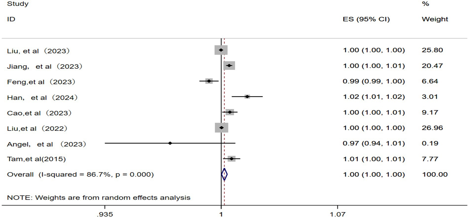 A total of eight studies (10, 12, 14, 17, 19, 22, 23, 25) were included for meta-analysis using a random effects model after the confirmation of significant statistical heterogeneity (p = 0.000, I2 = 86.7%). The corresponding analysis (Figure 7) revealed that a 10 μg/m3 increase in ambient O3 concentration was associated with an RR of 1.00 (95% CI: 1.00–1.00) for IHD-attributable hospitalization, as presented in Figure 7.