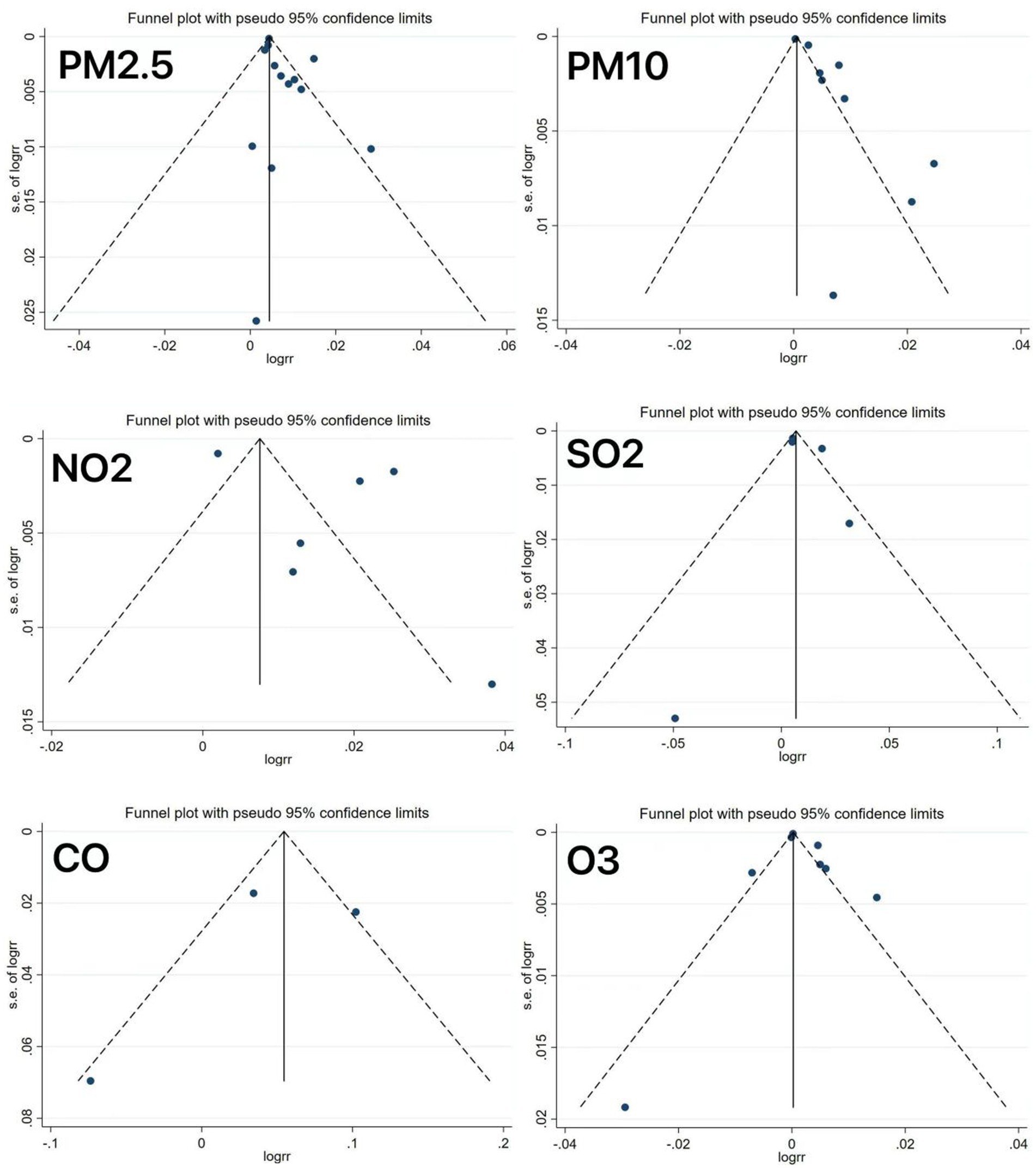 However, it should be acknowledged that this study still has several limitations. First, the included studies, despite high quality, could not fully account for confounding factors. Second, in addition to substantial heterogeneity, our sensitivity analyses and meta-regression failed to identify influencing factors, potentially due to the following reasons: (1) varied follow-up durations across the studies resulting from different study designs, which may have impacted the effect estimates and (2) inter-study differences in sampling methods, age and sex ranges, and sample sizes. In addition, funnel plot asymmetry in some analyses suggested potential publication bias, possibly leading to overestimation or underestimation of effects, which may compromise the reliability of the conclusion and misguide clinical decisions. Therefore, in the future, it is essential to conduct multi-center, large-sample studies to verify the specific roles of these factors in pollutant-specific emergency admission risks, along with stricter preregistration and improved transparency to reduce publication bias.