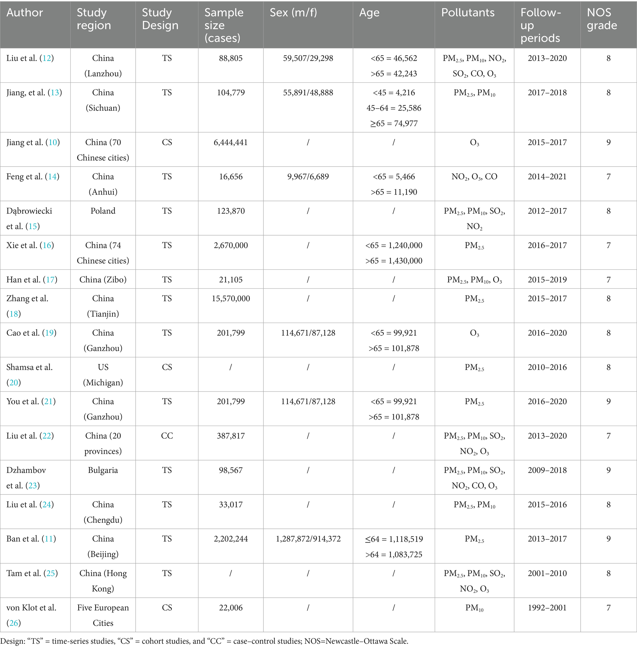 Among the 17 included studies (10–26), there were three cohort studies (10, 20, 26), one case–control study (22), and 13 time-series studies (11–19, 21, 23–25). The methodological quality of the included literature was evaluated using the Newcastle–Ottawa Scale (NOS) to identify the risk of bias across three domains: selection, comparability, and outcome. With a maximum score of 9, this scale classified studies scoring ≥7 as high-quality.