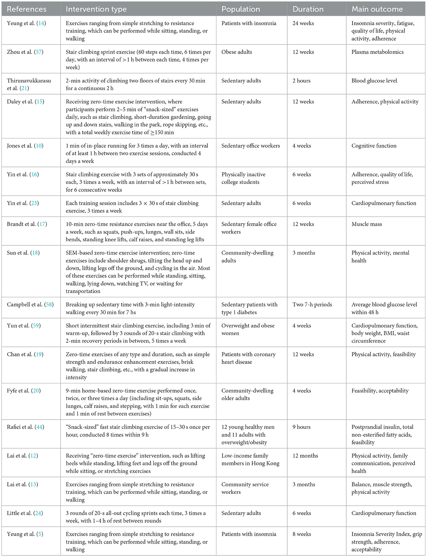 To ensure a comprehensive overview of the current evidence on ZETx, a structured literature search and selection process was conducted. This review adopted a narrative synthesis approach, aiming to summarize and critically appraise the existing literature rather than to perform a quantitative meta-analysis. The present study conducted a search in electronic databases (PubMed, Embase, Web of Science, Cochrane Library) using appropriate search terms related to zero-time exercise. The search terms included “zero time exercise, “exercise snack,” “exercise snacks,” “exercise snacking,” “incidental physical activity,” “vigorous intermittent lifestyle physical activity,” “micro exercise,” “Snacktivity,” and “short bouts of exercise.” The titles and abstracts were initially screened to identify potentially relevant studies. The search spanned from the inception of the databases to July 2025. The inclusion criteria were studies focusing on zero-time exercise and published in English. The exclusion criteria included studies not related to zero-time exercise, studies published in languages other than English, and studies without full-text availability. Given the heterogeneity in study designs, populations, and outcome measures, a narrative synthesis method was employed. The extracted information from the literature included authors, study population, intervention, duration of intervention, and outcome measures (Table 1).