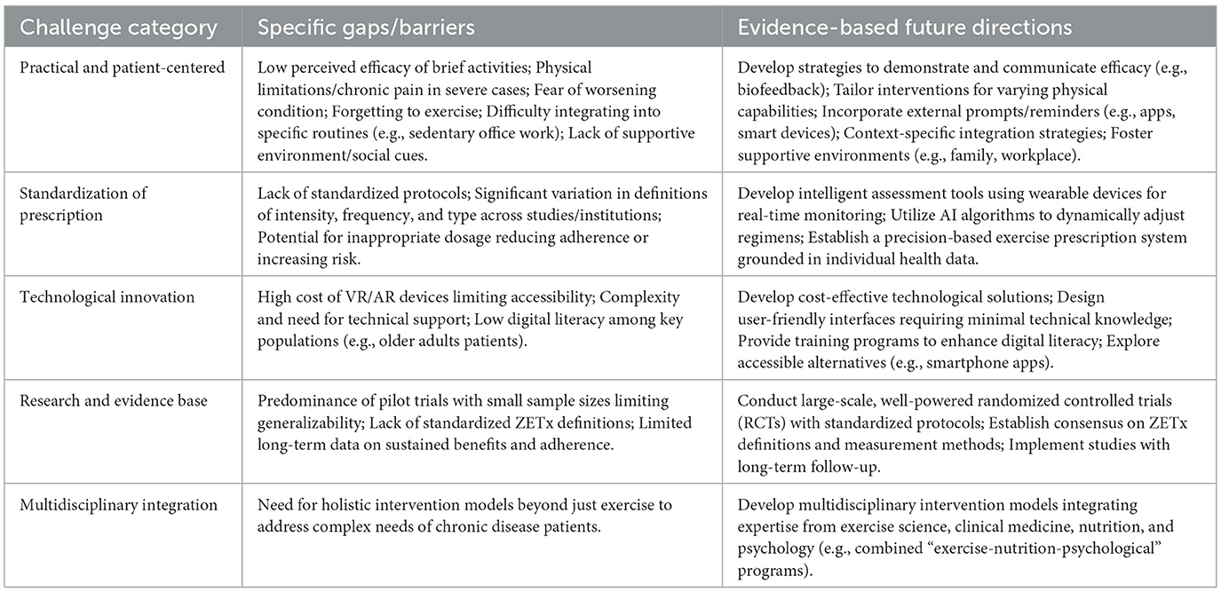 Despite its promise, the implementation of ZETx faces several practical challenges rooted in patient experiences and real-world applicability. A primary barrier is low perceived efficacy; some patients, particularly those accustomed to structured exercise, may doubt the health benefits of brief, sporadic activities, leading to low motivation and engagement (49). Furthermore, individuals with severe mobility limitations, chronic pain, or advanced disease may find even low-intensity ZETx movements physically challenging or may fear aggravating their condition without professional supervision (19). Environmental and social contexts also play a critical role; a lack of a supportive environment at home or work, or the absence of social cues and reminders, can hinder consistent practice (17). For instance, some patients in home-based studies reported forgetting to perform the exercises without external prompts (20), while others found integrating activity into certain daily routines (e.g., sedentary office work) more difficult than anticipated (44). These patient-centered insights highlight that the “ease” of ZETx is not universal and that successful implementation requires strategies to address perceived value, physical capability, and contextual barriers.