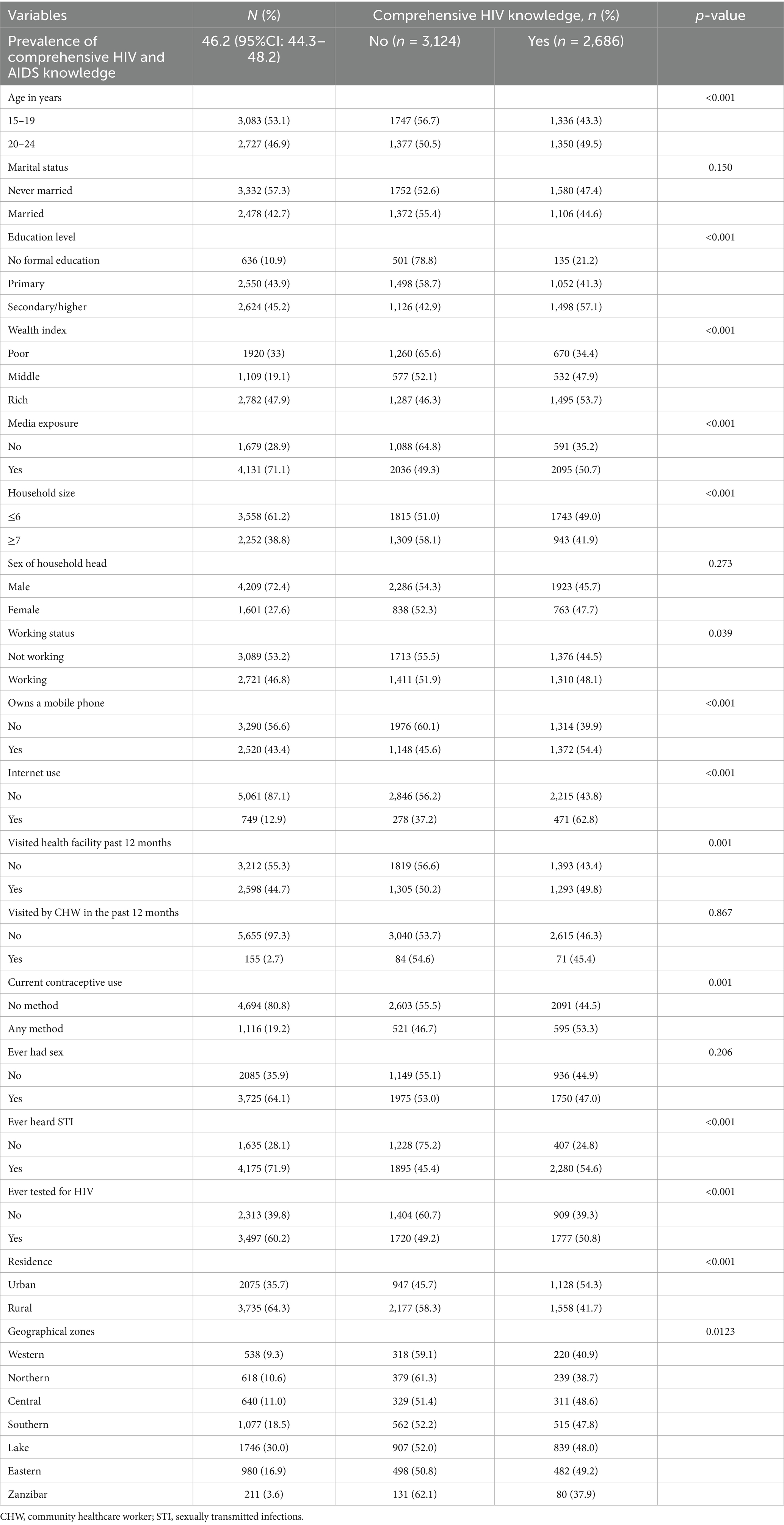 This study aimed to assess comprehensive knowledge about HIV and AIDS and associated factors among AGYW in Tanzania using a secondary analysis of a nationwide survey. The observed prevalence of comprehensive HIV and AIDS knowledge among AGYW at 46.2% aligns with findings from several contexts but indicates room for improvement. This prevalence is comparable to the overall regional estimate of 41.6% reported across 30 SSA countries, where comprehensive knowledge ranged widely from as low as 15.0% in Congo to as high as 74.3% in Rwanda (22). Similarly, a study in Malawi reported a slightly lower prevalence of 42.2% among AGYW, highlighting consistent challenges in achieving widespread HIV awareness in the region (23). In contrast, Rwanda reported a higher prevalence of 53.6%, reflecting the impact of intensified HIV educational programs and media outreach (3). Globally, comprehensive knowledge among AGYW remains suboptimal, with less than half of young women demonstrating full understanding of HIV transmission and prevention (3, 22). These variations emphasize the critical role of specific interventions in increasing comprehensive HIV and AIDS knowledge. This prevalence calls for renewed efforts to expand comprehensive sexuality education and accessible information dissemination to close existing knowledge gaps and reduce HIV incidence among this vulnerable population.
