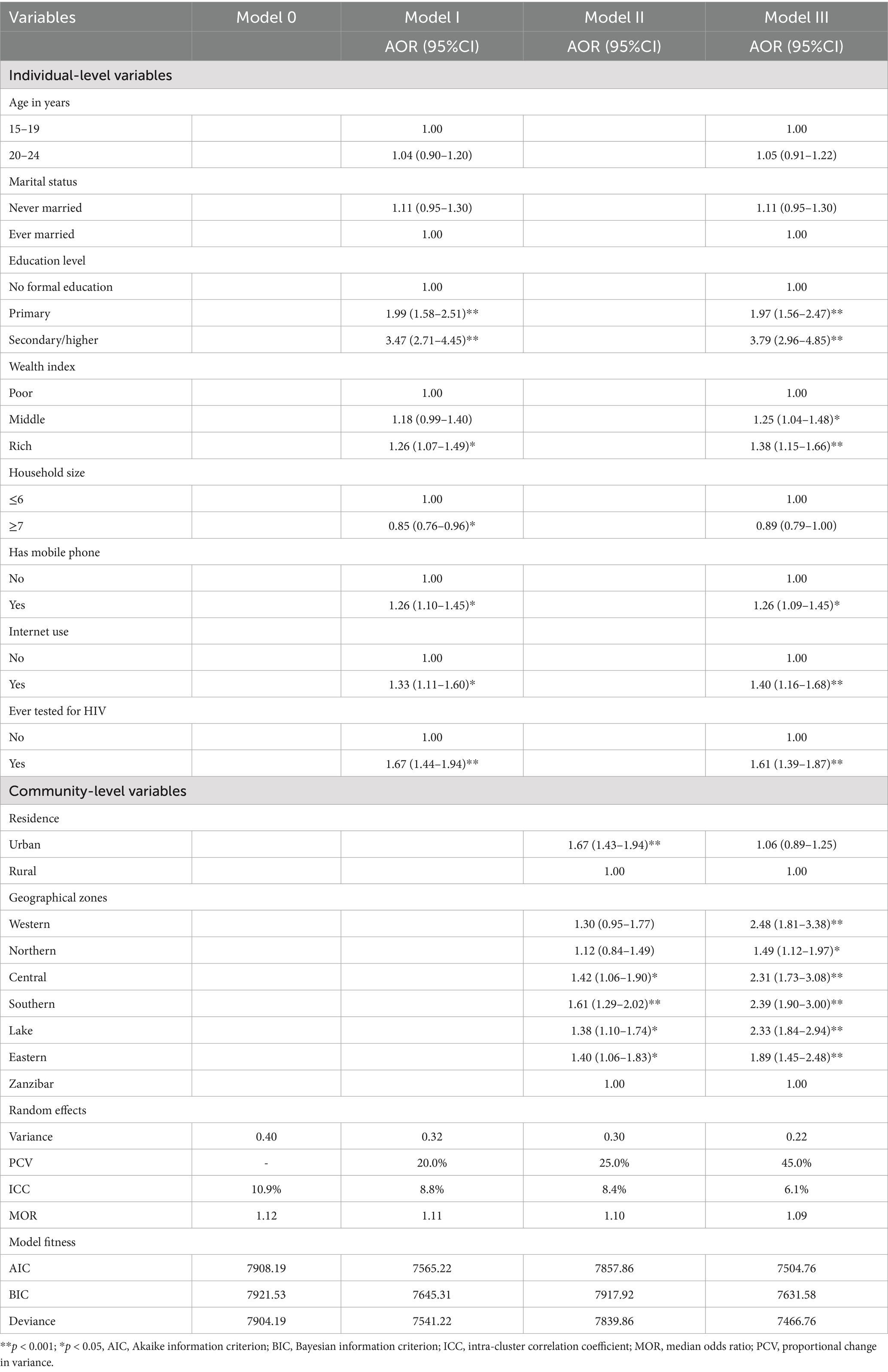 The current study examined variables at the individual and community levels based on the available data and literature. The following variables were included under the individual level; age in years (15–19 or 20–24), education level (no formal education, primary, secondary or higher), marital status (never married, married), wealth index (poor, middle or riche), media exposures (yes as listening to radio, reading newspaper or watching Television less than once a week or at least once a week or no if otherwise), ever had sex (yes or no), working status (working or not working), number of sexual partners (none, one or more), current contraceptive use (none or any method), sex of household head (male or female), owns mobile phone (yes or no), visited health facility in the past 12 months (yes or no), visited by community health worker (yes or no), ever tested for HIV (yes or no) and ever heard of STI (yes or no). The following variables were included under the community level: place of residence (urban or rural) and geographical zones (western, northern, central, southern, eastern or Zanzibar).