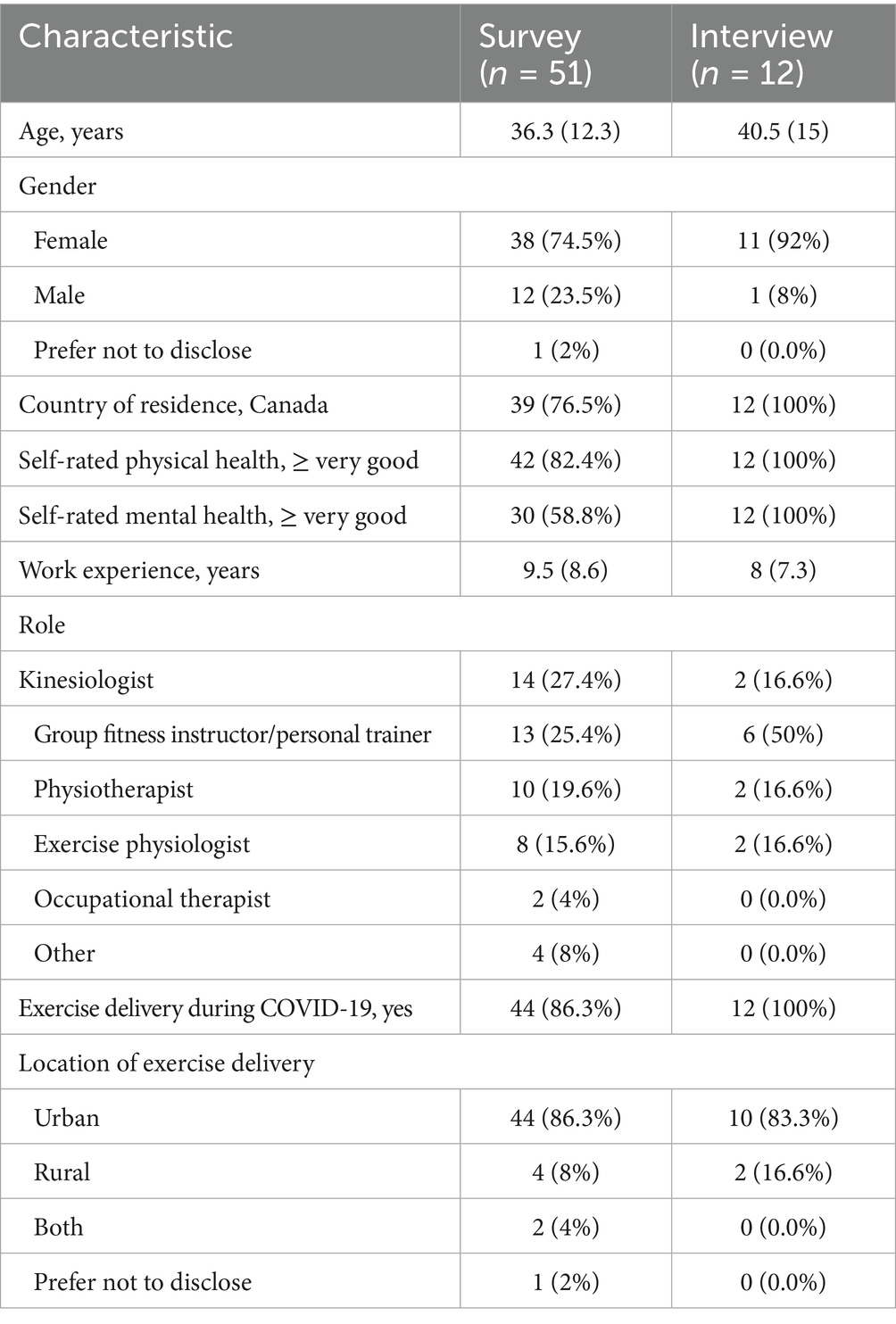 Of thirty survey respondents who expressed interest in a follow-up interview, twelve ultimately participated (5 by phone, 7 via Zoom). The remaining individuals did not respond to follow-up communication. Interviewees had a mean age of 40.5 ± 15.0 years, with 92% identifying as female. They averaged 8 years of work experience, and 83% held an exercise provider certification or professional designation. All resided in Canada and reported very good or excellent physical and mental health. Participant characteristics are presented in Table 1.