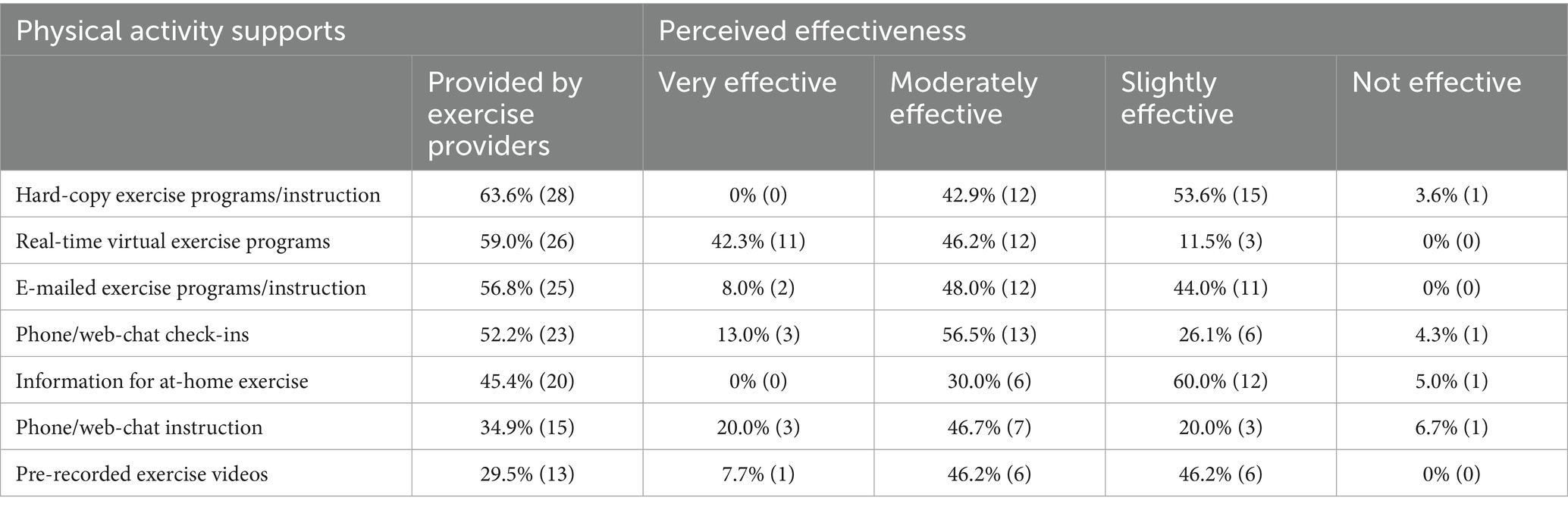 Before the pandemic, most providers offered no remote exercise programming or services (median 0%). In contrast, during the survey period, 96% of programming and supports shifted to remote delivery, with a median transition time of 2 weeks (range: 0–12 weeks). The most common remote supports included hard copy materials (63%) and real-time virtual programs (59%). The use of other supports is described in Table 2.