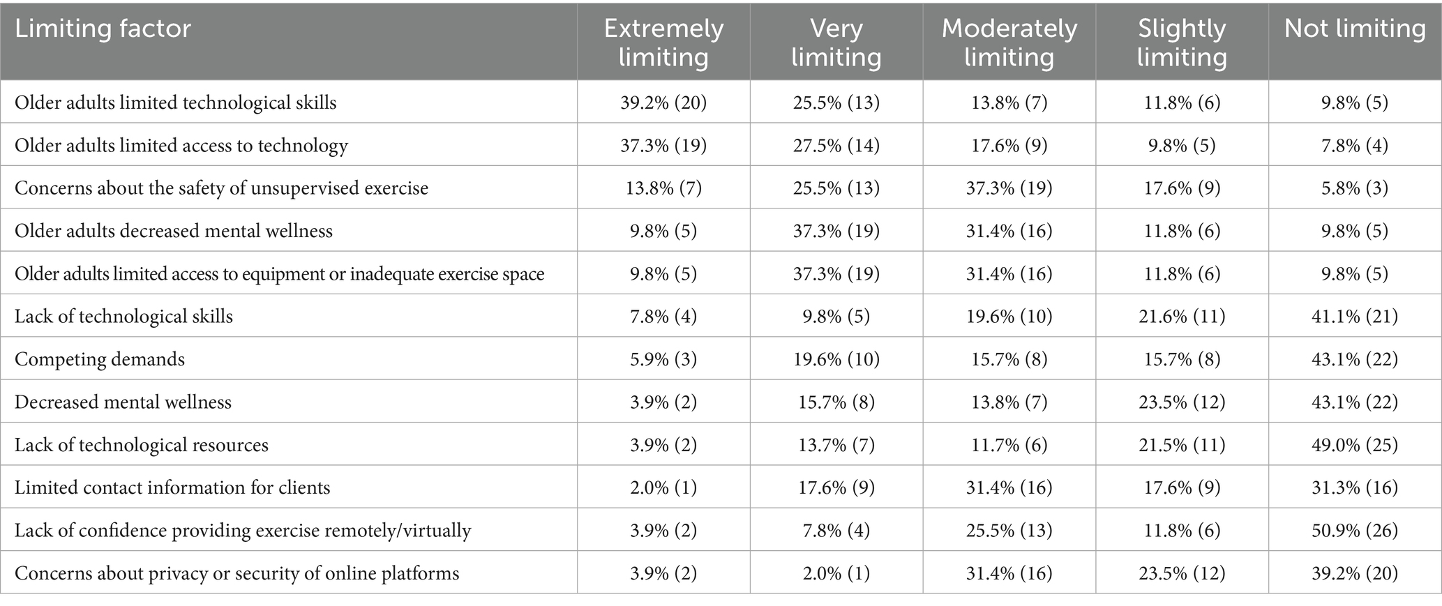 Table 3 summarizes exercise providers perceived barriers to remote support of physical activity during the early stage of the pandemic. Most providers rated older adults’ limited technology access (82%) and lack of technical skills (78%) as “moderately limiting” or “extremely limiting.” Nearly half (47%) also viewed older adults decreased mental health and lack of at-home exercise equipment as “moderately limiting” or “extremely limiting.”