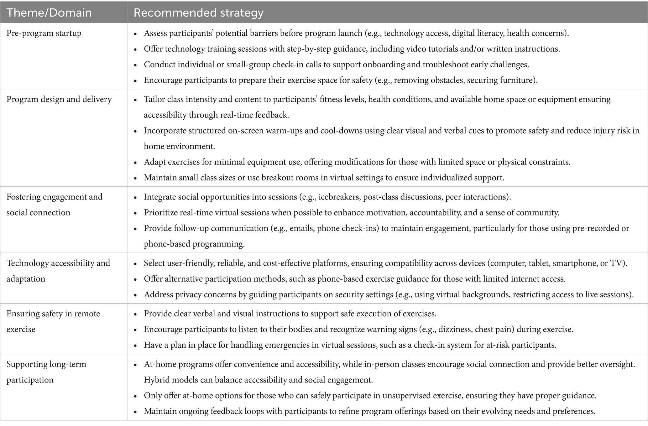 Exploring a hybrid approach that combines in-person and remote delivery received highly favorable feedback from participants, with enhanced program accessibility frequently cited as a key benefit. Hybrid models offer the potential to overcome barriers that traditionally hinder older adults’ participation in physical activity programs, such as transportation difficulties, inclement weather and time constraints, by offering flexible delivery options that integrate the convenience of at home sessions with the structured support of in-person training (12, 67, 74–76). A recent systematic review and meta-analysis (75) found that remotely supervised exercise interventions delivered via videoconferencing are both feasible and effective for improving physical function, muscle strength, emotional well-being, and quality of life in older adults. Notably, the outcomes were comparable to those of in-person programs, particularly when real-time interaction with exercise professionals was maintained (75).