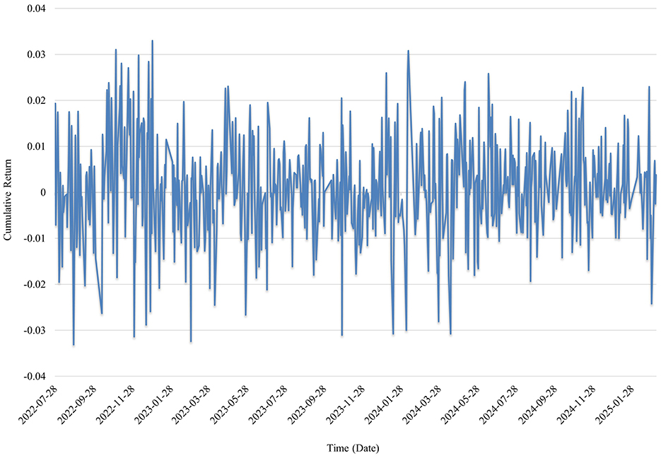 In Figure 6, during the post-pandemic period (2023–2025), the cumulative return curve remains generally flat with narrowed fluctuations, with most returns concentrated around the ±0.01 range, indicating reduced market volatility. The market valuation of public health-related firms tends to become more rational in the post-pandemic phase, investor expectations gradually stabilize, and short-term speculative sentiment significantly weakens. The industry has transitioned from an early stage dominated by sentiment to a steady state primarily driven by fundamentals.