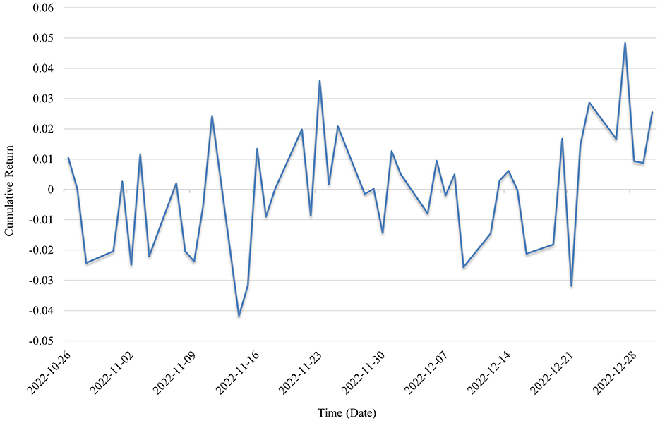 In the third year of the pandemic (2022; as shown in Figure 5), the cumulative return range of the public health sector investment portfolio expanded significantly. The overall return curve lacked a clear direction, featuring alternating spikes and sharp pullbacks, reflecting unstable market sentiment and the dominance of news-driven movements. Some pandemic-related firms benefited temporarily from policy subsidies or expectations of supply shortages, resulting in short-term surges. In contrast, traditional healthcare service companies faced performance pressure and demand uncertainty. Policy shifts became a key variable, with stock prices showing particularly sharp short-term volatility during transitions, such as from the “zero-COVID” strategy to “targeted prevention and control.”