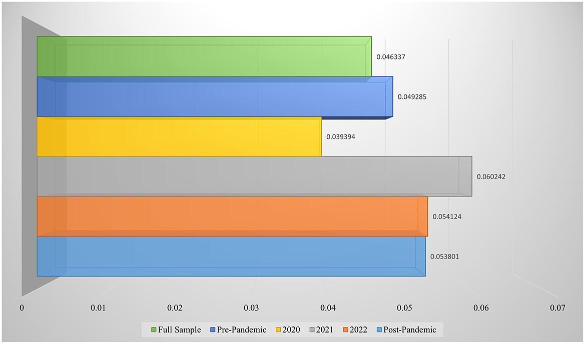 From Table 3, the annualized average returns of the long–short portfolio exhibit notable variation across different periods. In 2020 (the initial phase of the pandemic), the annualized return reached 0.537138, the highest among all phases, reflecting substantial structural opportunities for excess returns in public health-related firms amid the outbreak. In contrast, returns sharply turned negative in 2021 and 2022 (−0.589107 and −0.120103, respectively), indicating that repeated policy shifts and sectoral restructuring led to heightened market turbulence. During the post-pandemic period (2023–2025), the portfolio showed marginal recovery, however, the return remained slightly negative at −0.013514. This suggests that, following a reversion to rational pricing mechanisms, short-term investment returns in the public health sector became relatively muted. The Sharpe ratio—a key indicator of risk-adjusted return—exhibits a trajectory broadly consistent with that of annualized returns. In 2020, the ratio peaked at 2.856251, reflecting the superior risk–return profile of public health-related assets amid heightened uncertainty. However, during the mid- to late-pandemic periods, the ratio turned negative, with a particularly sharp decline in 2021 to −2.513340, indicating a substantial increase in volatility and downside risk. Although there was a slight rebound in the post-pandemic phase (−0.079009), the overall performance remained weak, suggesting inadequate compensation for the risk undertaken. As shown in Table 3, the Sortino ratio peaked in 2020 at 3.632034, marking the highest value across all periods. This indicates that during the initial outbreak of the pandemic, certain public health-related companies—such as those involved in vaccine development, biomedical testing, and epidemic prevention equipment—experienced a surge in capital inflows, achieving high returns with relatively low downside risk. In contrast, the pre-pandemic (−0.050146) and post-pandemic (−0.135693) phases exhibited Sortino ratios close to zero, suggesting that investment portfolios during these periods lacked effective downside risk protection, and the return volatility was more difficult for investors to hedge. In 2021 (−3.535249) and 2022 (−0.683095), the Sortino ratios were negative, with 2021 marking the lowest point. This reflects a severe imbalance between returns and downside risks, driven by prolonged pandemic disruptions and recurrent policy shifts. The data highlight how excessive market responses to evolving risks severely undermined investment performance during these stages.