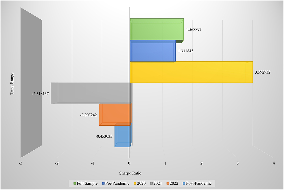 As shown in Figure 8, the Sharpe ratio for the full sample period is 1.568897, indicating that the long-only portfolio constructed using the SVM model achieved strong risk-adjusted returns over the long term, maintaining stable performance throughout multiple waves of pandemic shocks and recovery cycles. The pre-pandemic Sharpe ratio stood at 1.331845, suggesting that, prior to the outbreak, public health–related enterprises operated in a context of stable market expectations and reasonable risk premiums. During this period, the model effectively captured fundamental industry signals and long-term valuation trends, yielding solid investment returns. In 2020, at the onset of the pandemic, the Sharpe ratio peaked at 3.592932—the highest among all periods—reflecting a phase of structural repricing in the capital market triggered by the public health emergency. Leading enterprises in pandemic-related sectors realized substantial excess returns, and the SVM model successfully identified these trend-driven opportunities and delivered high risk compensation. However, the strategy broke down in 2021, with the Sharpe ratio plunging to −2.318137, indicating severe underperformance. This period was marked by heightened uncertainty under normalized pandemic control, frequent policy shifts, and repeated valuation adjustments, all of which rendered the model's signals ineffective and led to large losses, with risks significantly outweighing returns. In 2022, the Sharpe ratio slightly recovered to −0.907242, yet remained in negative territory, signaling that the market had not yet fully adapted to the evolving policy rhythm or valuation logic within the public health sector. Investor confidence remained weak, and health-related stocks lacked clear upward trends. In the post-pandemic period, the Sharpe ratio further improved to −0.453035 but failed to return to positive levels. During this stage, earnings expectations for public health firms normalized, and the absence of new policy catalysts or heightened investor attention led to subdued profitability in a low-volatility environment.