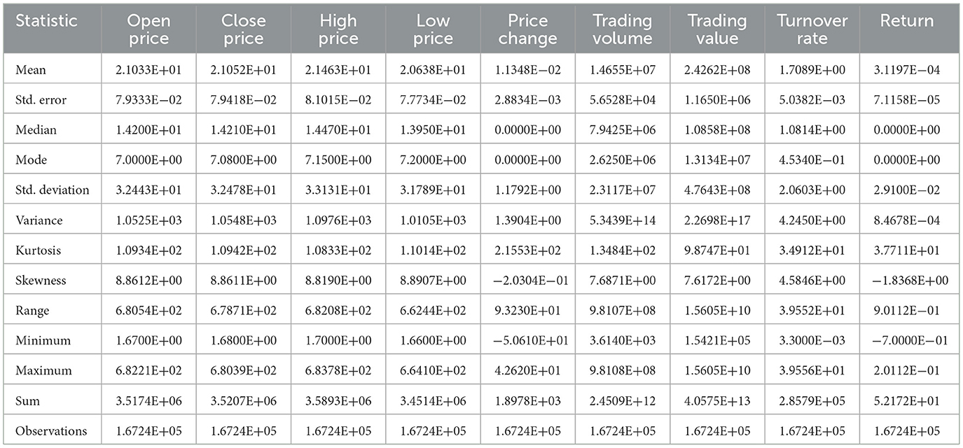 Considering data completeness and availability, this study selects daily data spanning from March 2, 2012, to March 7, 2025, to construct the analysis sample. After excluding firms with missing data, trading suspensions, or delistings that prevent inclusion in the study, a final sample of 55 publicly listed companies from the CSI Public Health Index—each closely related to the public health sector—was identified as the research target. For each stock, eight technical and trading features are used as input variables: opening price, closing price, highest price, lowest price, price change, trading volume, trading value, and turnover rate. The output variable is the daily return, which serves as the prediction target for the Transformer model. Descriptive statistics for the selected features are presented in Table 1.