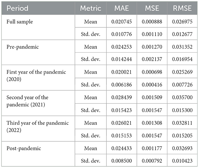 To further examine the stage-specific impact of major public health events on the investment value and predictability of public health-related stocks, this study utilizes daily data from 55 constituent companies of the CSI Public Health Index over the full sample period from March 2, 2012, to March 7, 2025. The data are divided into five structurally significant sub-periods, each corresponding to a distinct market environment and risk profile associated with the pre-, during-, and post-pandemic phases. The detailed segmentation is as follows: (1) Full sample period (2012.3.2–2025.3.7): encompasses the pre-pandemic, pandemic, and post-pandemic phases; used for overall model training and comprehensive performance evaluation. (2) Pre-pandemic period (2012.3.2–2019.12.31): represents the normal functioning of China's capital markets under stable structural and policy conditions, serving as a crucial reference period for baseline model construction. (3) First year of the pandemic (2020.1.1–2020.12.31): characterized by the sudden outbreak of COVID-19, during which the capital market experienced extreme volatility. Public health-related firms drew intensive attention, leading to pronounced divergence in stock performance. This phase tests the model's adaptability under crisis conditions. (4) Second year of the pandemic (2021.1.1–2021.12.31): marked by the normalization of pandemic control and frequent policy adjustments, this period witnessed substantial transformation in business environments, providing a benchmark to assess the generalization ability of the predictive model. (5) Third year of the pandemic (2022.1.1–2022.12.31): featured continuous virus mutation and repeated shifts in control strategies, resulting in heightened industry uncertainty and complex market responses. This stage poses significant challenges to the stability of the prediction system. (6) Post-pandemic period (2023.1.1–2025.3.7): a stage of macroeconomic recovery and industrial revitalization, during which public health enterprises transitioned from emergency response to high-quality development. The capital market returned to fundamentals-driven logic, making this phase ideal for evaluating the model's effectiveness in “recovery markets” and its portfolio optimization capacity. Regarding the division of time periods, this study draws on the approaches of Lee et al. (54), Sobczak and Pawliczak (55), and Jin et al. (56), while making adjustments based on the specific trajectory of the COVID-19 outbreak and policy responses in China. When applying the Transformer model, 80% of the data is used as the training set, and the remaining 20% is designated as the testing set. The prediction results for different time periods are presented in Table 2.