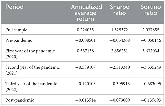 In Equations 13, 14, denotes the average return of the investment portfolio, Rf is the risk-free rate, and N represents the annualization factor. The term σd refers to the downside deviation, which captures the standard deviation of returns falling below the risk-free rate by computing the squared deviations and averaging only over the negative return observations. This emphasizes the portfolio's ability to manage downside risk. A higher Sortino ratio indicates that the portfolio achieves greater excess return while being exposed to limited downside risk. The Sortino ratio is particularly sensitive to capital preservation and stable returns, making it especially appropriate for investors with low risk tolerance—such as those active in extreme market environments like public health crises. In summary, this study employs a three-dimensional performance evaluation framework—comprising annualized return, Sharpe ratio, and Sortino ratio—to assess the long–short portfolios from the perspectives of total return generation, risk-adjusted efficiency, and downside risk control. This framework facilitates robust comparisons across time periods and investment strategies, thereby enhancing the credibility of the empirical findings and their relevance for policy recommendations. It is especially well-suited for examining the risk–return reallocation patterns triggered by structural shifts in financial markets under the influence of public health emergencies.