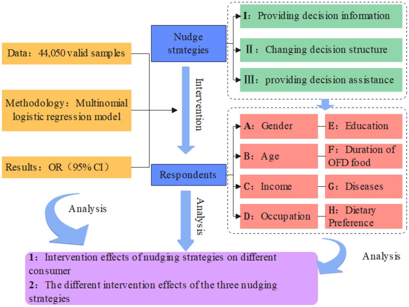 Methods: The objective of this study is to design a choice environment on online platforms through nudge strategies, so as to reduce the cognitive resistance and inertia of consumers in decision-making. By means of guidance rather than coercion, it enables consumers to make healthy choices more easily and proactively, thereby promoting the occurrence of healthy eating behaviors invisibly. Based on the subdividing of respondents based on the characteristics of consumer groups, we explored the different expected intervention effects of providing decision information, changing decision structure, and providing decision-making assistance-type nudging strategies on consumers with different characteristics. This paper divides the nudging strategies into three categories: providing decision information type, changing decision structure type, and providing decision assistance type. The subjects of this paper must be consumers who have their own experience of eating online food and beverages. A total of 44,050 valid samples were collected.