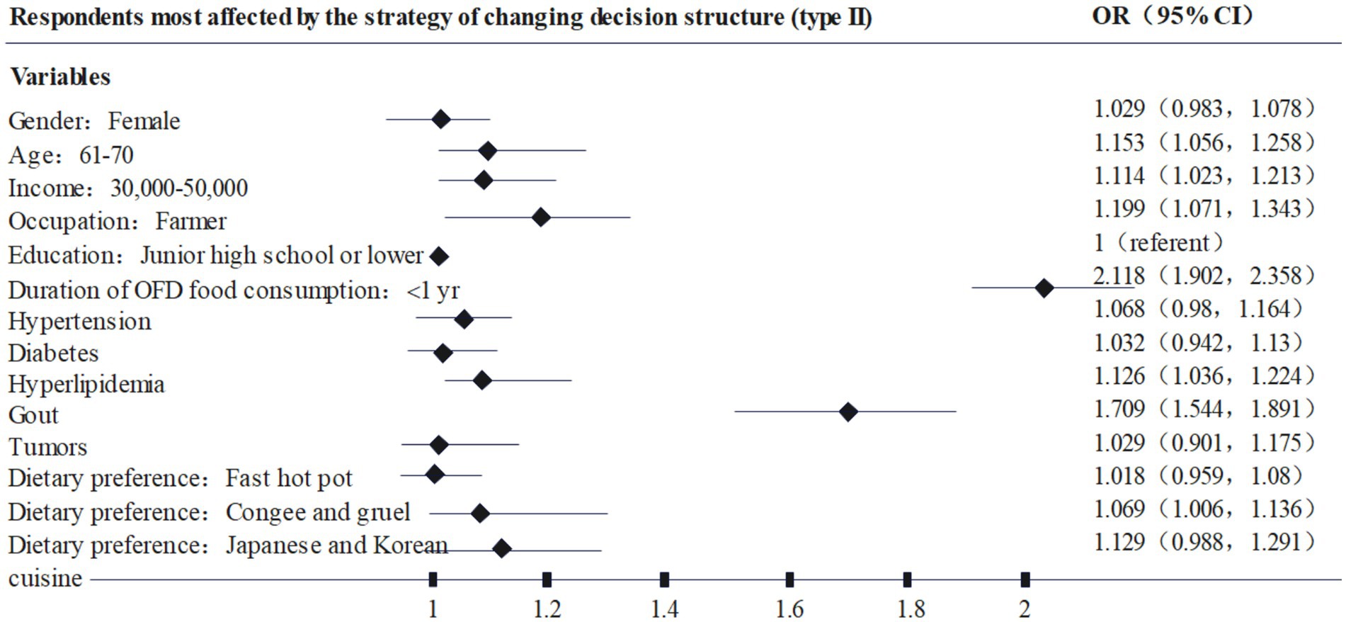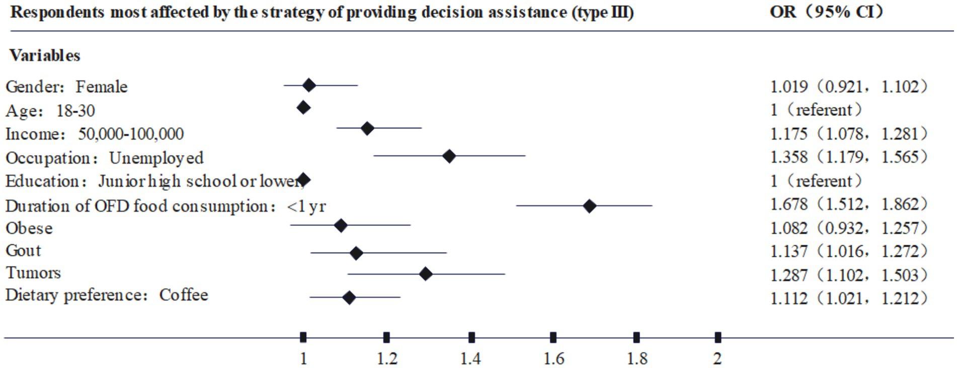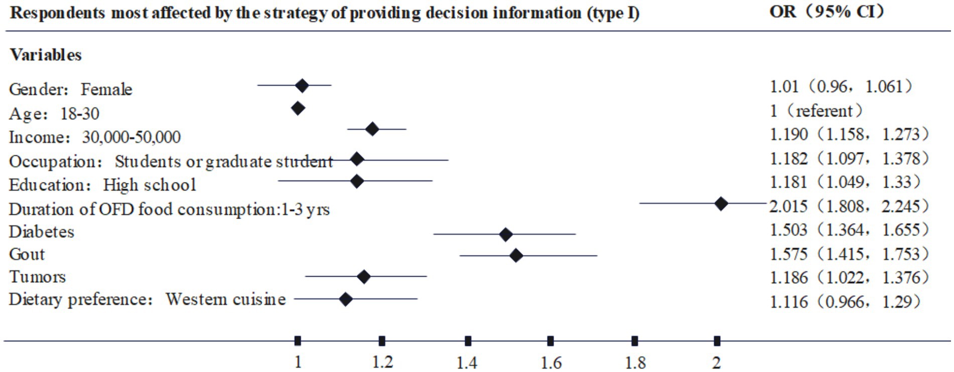 Further, based on the different types of respondents, this paper plots Figures 2–4 based on the highest odds ratio (OR) of each type, summarizing the types of respondents who are most susceptible to type I, II, and III. nudging strategies. For example, Figure 2 shows that the characteristics of the respondents who are most likely to be affected by the Type I nudging strategy are: female, age 18–30, annual income of 3–50,000, occupation as student, high school education, online food consumption history of 1–3 years, diabetes, gout, cancer, and dietary preference for Western food. Through Figures 2–4, it can be found that the respondents who are susceptible to the impact of type I., II., and III. nudging strategies have some of the same characteristics, such as women, lower education levels, lower income consumers, and patients with chronic diseases are more susceptible to the intervention of healthy diet nudging strategies. However, there are differences in the impact of the three types of nudging strategies on respondents, for example, type I and type III nudging strategies are more likely to affect younger respondents, while type II is more influential on older respondents. At the same time, the three nudging strategies had different impacts on respondents with different occupations and dietary preferences. Therefore, research Hypothesis 2 holds, that is, different categories of nudge strategies have varying degrees of impact on the respondents’ healthy eating behaviors.