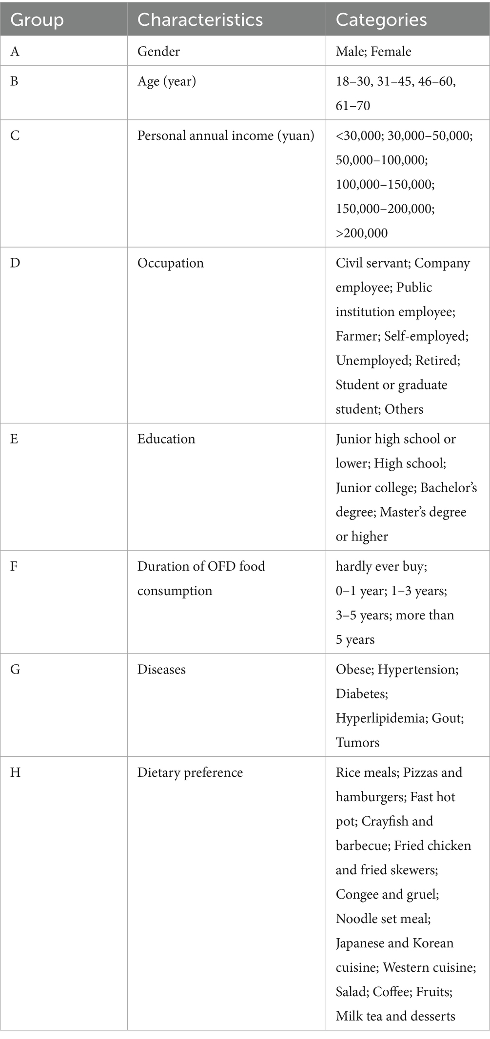 This paper studies the expected effectiveness of intervention strategies that promote healthy eating behaviors. At the same time, different types of consumers evaluate the feedback differences in different categories of nudging strategies, and constructs a research framework diagram as shown in Figure 1. This paper divides the nudging strategies into three categories: providing decision information type (I), changing decision structure type (II), and providing decision assistance type (III). According to Bang et al. (38), facing people with different characteristics and for different intervention content, the same nudge strategy may have different effects. Therefore, this article classifies respondents according to consumer group characteristics. The basis for setting group characteristics is to learn from the research of Loibl et al. (39), and include individual characteristics (gender, age, education, occupation), socio-economic characteristics (annual income), lifestyle and attitude towards life (online catering food history, dietary preference1) in the classification criteria. In addition, this paper designs a feature that distinguishes it from previous studies, namely whether the respondents suffer from chronic diseases (specifically divided into obesity, hypertension, diabetes, hyperlipidemia, gout, and tumors). The reason is that based on the study results of unreasonable dietary behaviors and dietary structures that are key factors in causing chronic diseases (8), the importance of healthy dietary interventions to patients with chronic diseases is self-evident. If targeted nudging strategies can be formulated based on this characteristic, it may help reduce the prevalence of chronic diseases and even the continuous increase in premature mortality (9). Therefore, this article grouped respondents based on the above eight consumer group characteristics, as shown in Table 1.