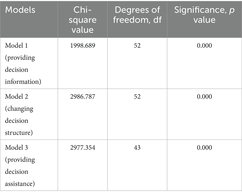 This paper verifies the overall validity of model coefficients through the Omnibus test to examine whether the model as a whole has explanatory power. As shown in Table 2, the Omnibus test results of the three models (models of the impact of three types of nudging strategies on respondents) are presented by Chi-square value, Degrees of Freedom (df), and significance (p value). It can be found that all Chi-square values are relatively large, indicating that after incorporating all independent variables, the model fitting effect is good, that is, the overall “contribution degree” of the coefficients is higher. The p value < 0.05 indicates that the model as a whole is valid and statistically significant.